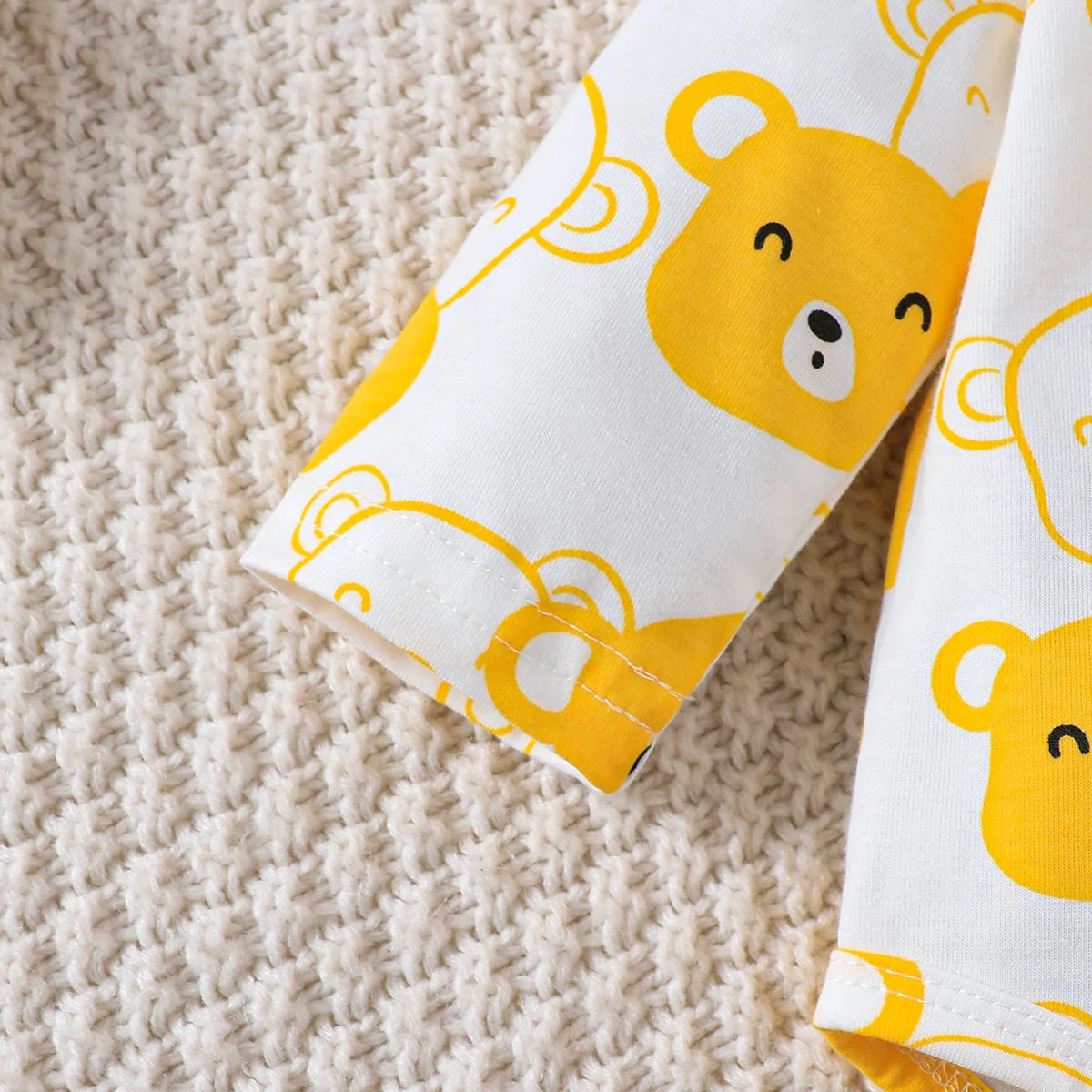 Featuring a pullover closure and an O-neck design, the outfit is easy to put on and take off, while the cartoon little bear pattern adds playful charm. The full-length sleeves and cozy pants keep your baby warm, making it ideal for daily wear, outings, or family photos. Designed to fit true to size, this set offers both style and practicality for baby boys aged 0-12 months.