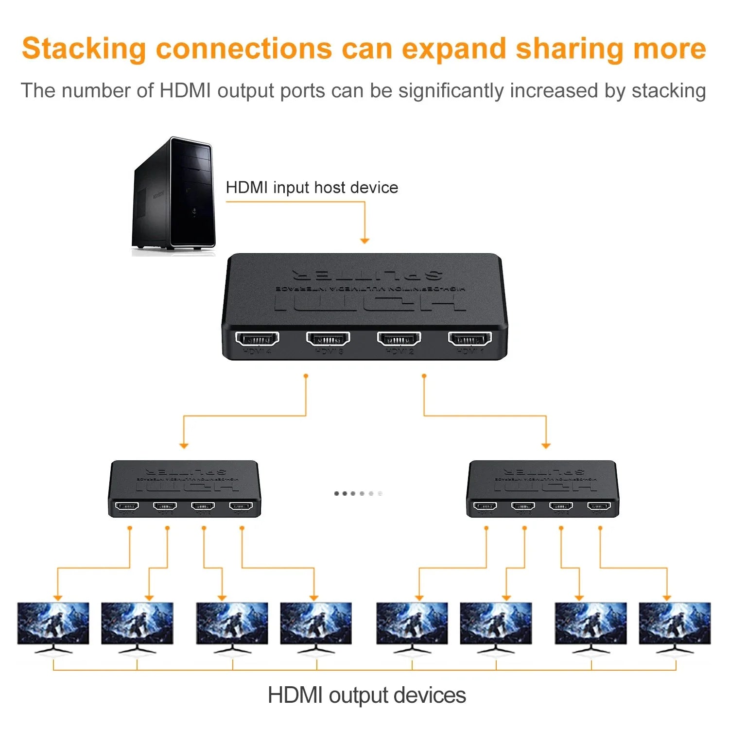 Effortlessly connect a single HDMI source to up to four displays—ideal for monitors, projectors, and HDTVs. Perfect for presentations, video conferencing, and home theaters. -