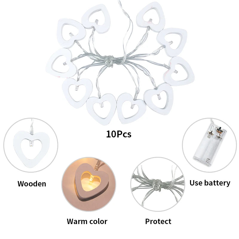 Romantic 10-Piece Valentine's Day Wooden Heart String Lights - LED Fairy Lights for Charming Love Lamp Garland, Perfect for Valentine's Day and Wedding Decor