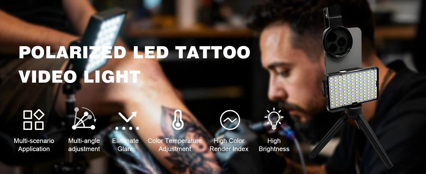 Capture every detail of your tattoo work with the YUELONG 120 LED Reduce Reflected Fill Light! Designed for tattoo artists and photography enthusiasts, this tattoo photography light minimizes glare and reflections, ensuring crisp, clear images of your art. Equipped with 120 high-brightness LED beads and a 52mm CPL circular polarizing filter, it delivers balanced, professional lighting that highlights every color and contour. Powered by a 3000mAh battery for up to 3.5 hours of continuous use, this compact, portable light is made from durable ABS material and finished in sleek black. Perfect for documenting tattoos, creating portfolios, or sharing your work online, the Reduce Reflected Tattoo Light is an essential tool for every professional tattoo artist seeking precision, clarity, and flawless photography.