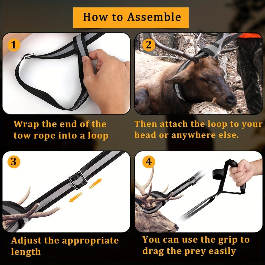 Non-Slip Adjustable Length for Maximum Control: The Heavy-Duty Deer Drag Rope features a non-slip design that stays firmly in your grip, even when navigating tough terrain. With its adjustable length, you can customize the strap to suit your needs, ensuring optimal control and leverage when dragging deer or other large animals.