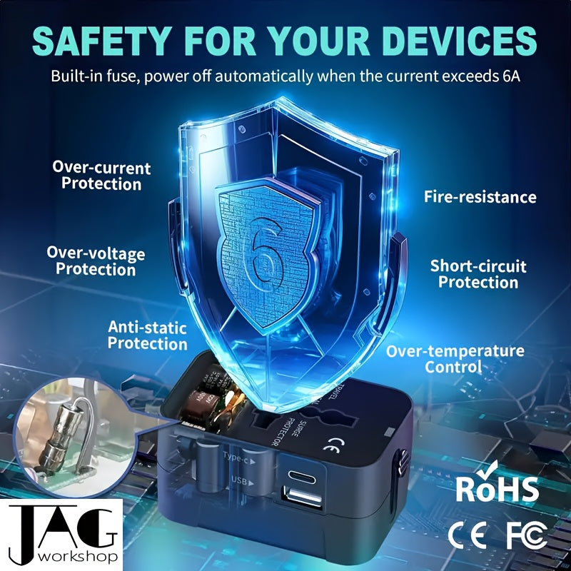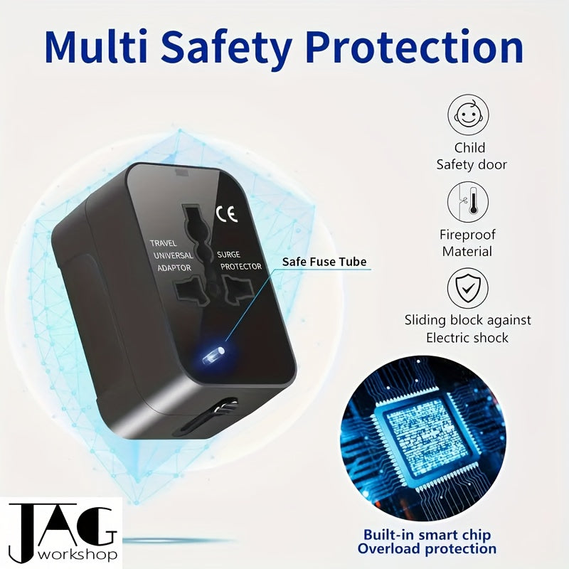 - Surge Protection: Built-in surge protection ensures your devices are protected from electrical surges and short circuits, offering peace of mind while you travel.