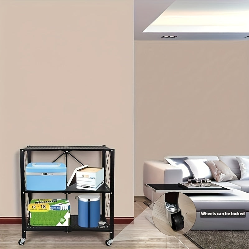 3 Tier Foldable Metal Storage Rack - Heavy Duty Organizer with Wheels for Garage & Kitchen, Easy Movement & Perfect Storage Solution