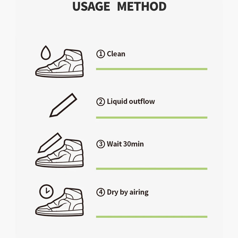 Using this pen is straightforward and hassle-free. Start by cleaning the area you want to treat. Then, press the pen tip to allow the liquid to flow out, and evenly apply it in a thin layer to the edges of your shoes. Wait for about 3 minutes, and then apply another layer for optimal results. Once you've applied the entire product, place your shoes in a cool place and let them dry before wearing them again.