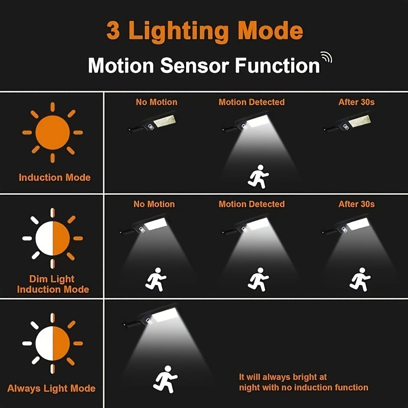 Choose from three lighting modes to suit your needs: always-on, dim mode with motion sensor, or bright mode with motion detection. The wireless motion sensor detects movement from a distance, automatically adjusting the brightness to provide extra security and visibility when needed. This smart feature helps conserve energy while ensuring your outdoor areas are well-lit and safe.