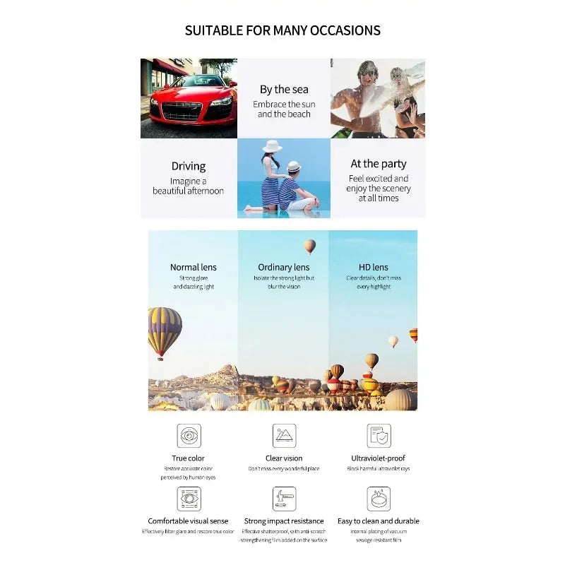 High-Quality Construction: Crafted with premium polycarbonate frames and TAC lenses, these sunglasses are built to last while providing exceptional comfort. The mirror, gradient, and photochromic lenses ensure crystal-clear vision and reduce glare, making them perfect for both casual outings and active days.