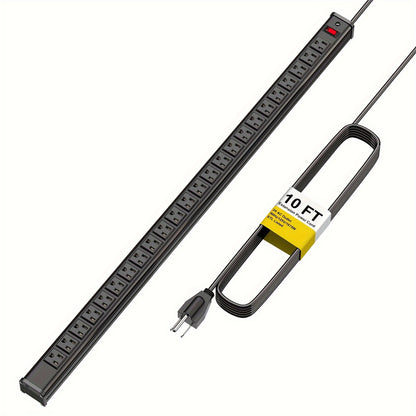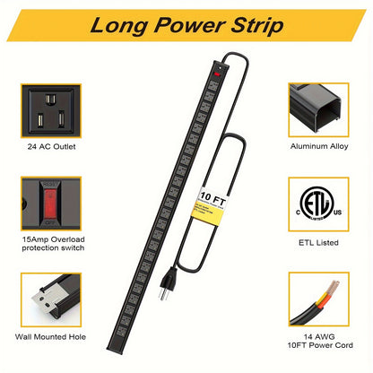 24 Outlet Heavy Duty Metal Power Strip - 10 Ft Extension Cord, Wall Mountable, Surge Protected, Space-Saving Design for Industrial, Commercial, and Home Use