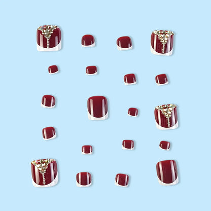 Step into the realm of effortless glamour with our 24pcs Retro Red False Toenails, a luxurious collection that brings the timeless elegance of red and the opulent sparkle of gold crystals right to your toes. These French full cover square head artificial toe nails are not just accessories; they are a statement of style, a nod to the classic with a twist of modern luxury. Designed for those who cherish sophistication and wish to add a touch of glamour to their appearance, these toenails are perfect for any occasion, from casual outings to grand evenings.