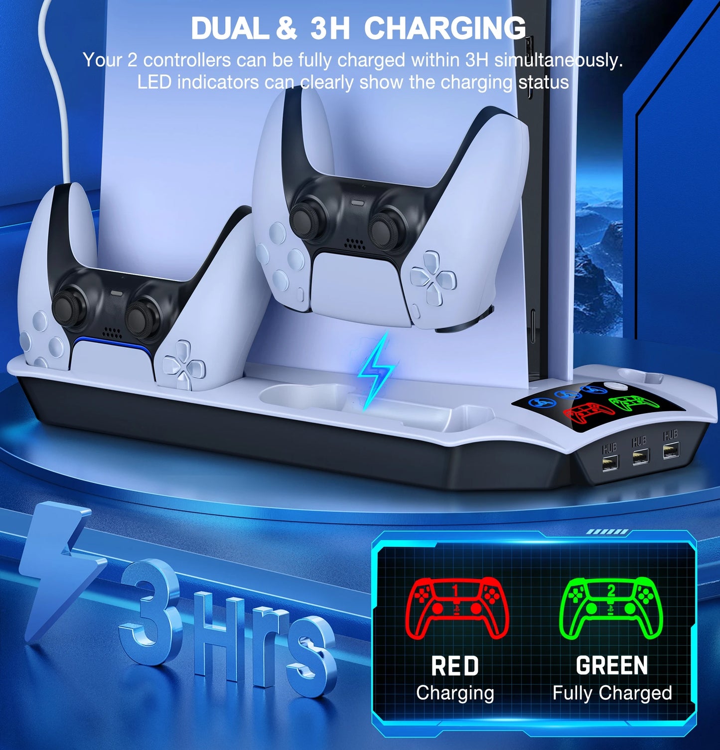 Never worry about running out of charge mid-game again! This stand features a dual controller charging dock, allowing you to charge two PS5 controllers simultaneously. With clear LED indicators, you'll know exactly when your controllers are charged and ready for action—red for charging and green for fully charged.