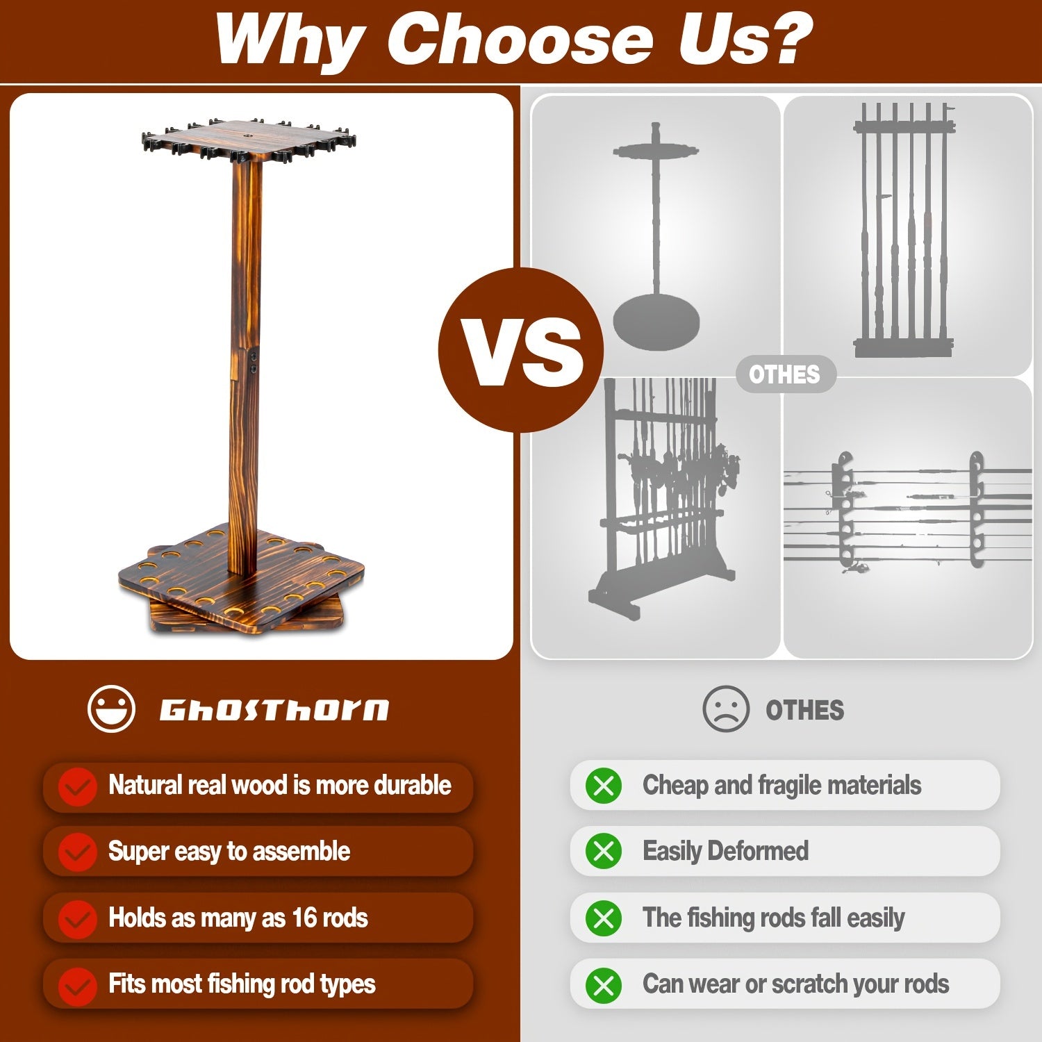 360-Degree Swivel 16-Rod Fishing Pole Storage Rack - Wooden Vertical Holder for Garage & Gear Organization - Secure Floor Stand Design