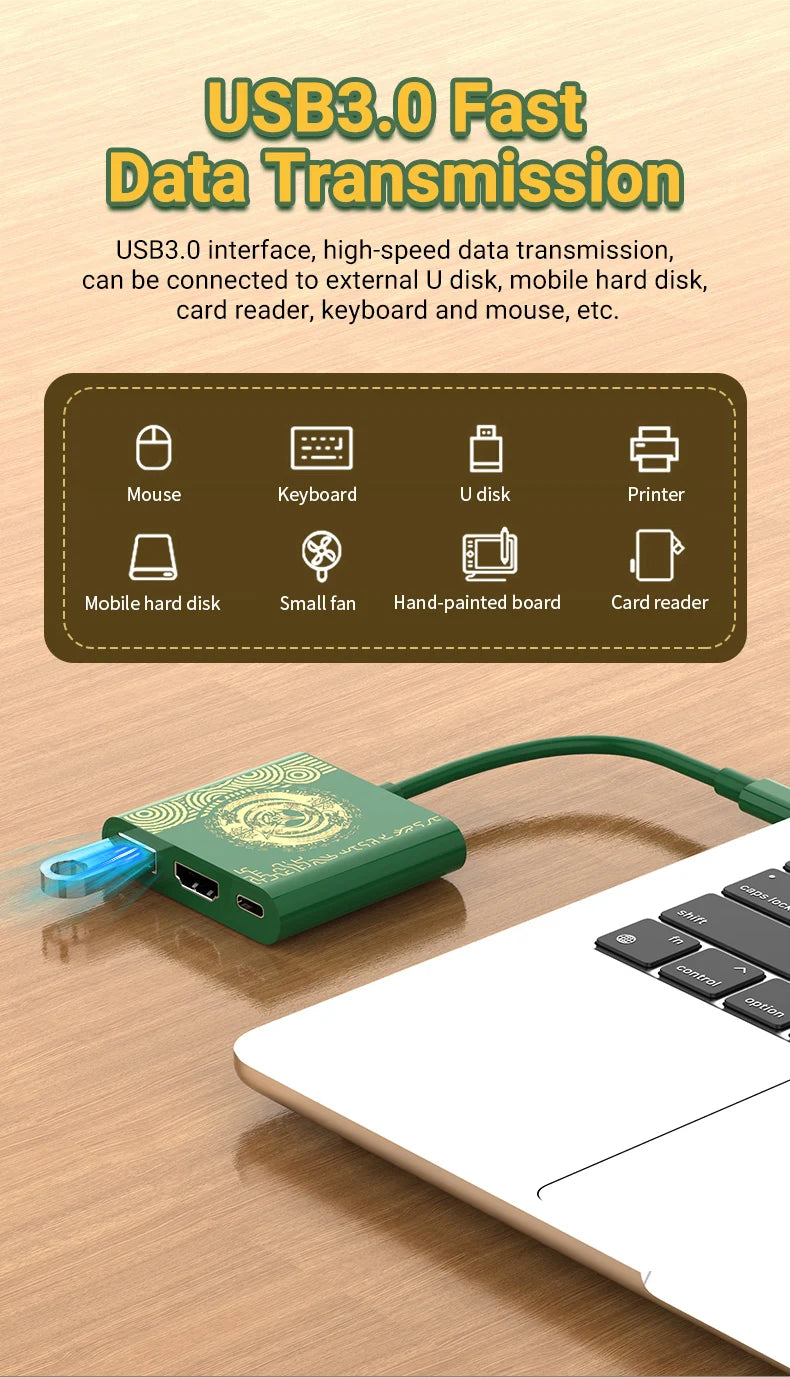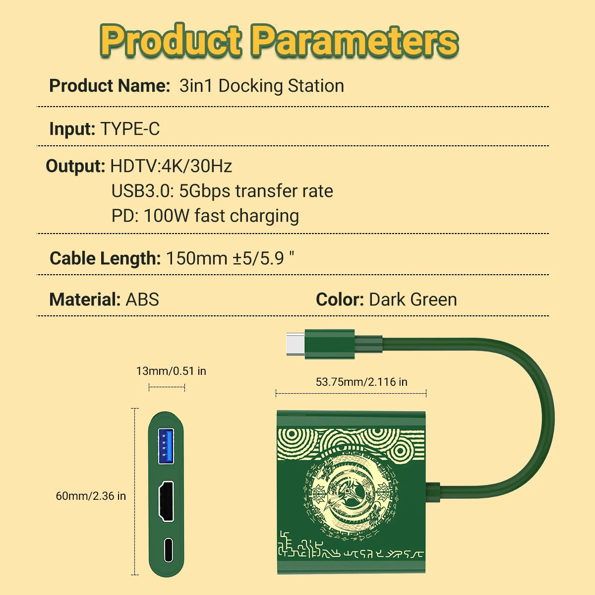 3-in-1 USB-C Hub: USB 3.0 port, HDMI port, and PD 100W charging in one device.