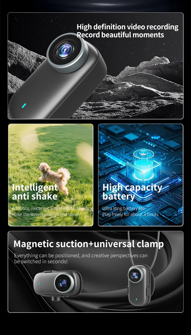 Designed for durability, this action camera features a precise sealing structure that resists splashes, dust, and outdoor challenges, ensuring reliable performance in all conditions. The magnetic suction ball head allows 360° rotation for upward, downward, and lateral shooting, letting you switch angles effortlessly. With support for 4K landscape recording, 2K, and 1080P video, every shot is crisp, vibrant, and smooth.
