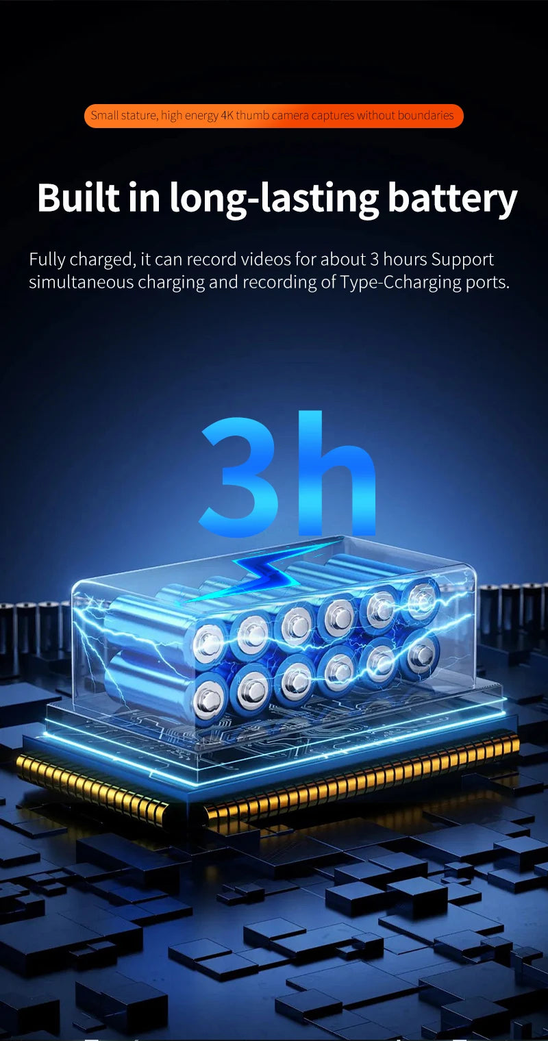 Extended Battery Life – 1000mAh battery for up to 3 hours continuous recording