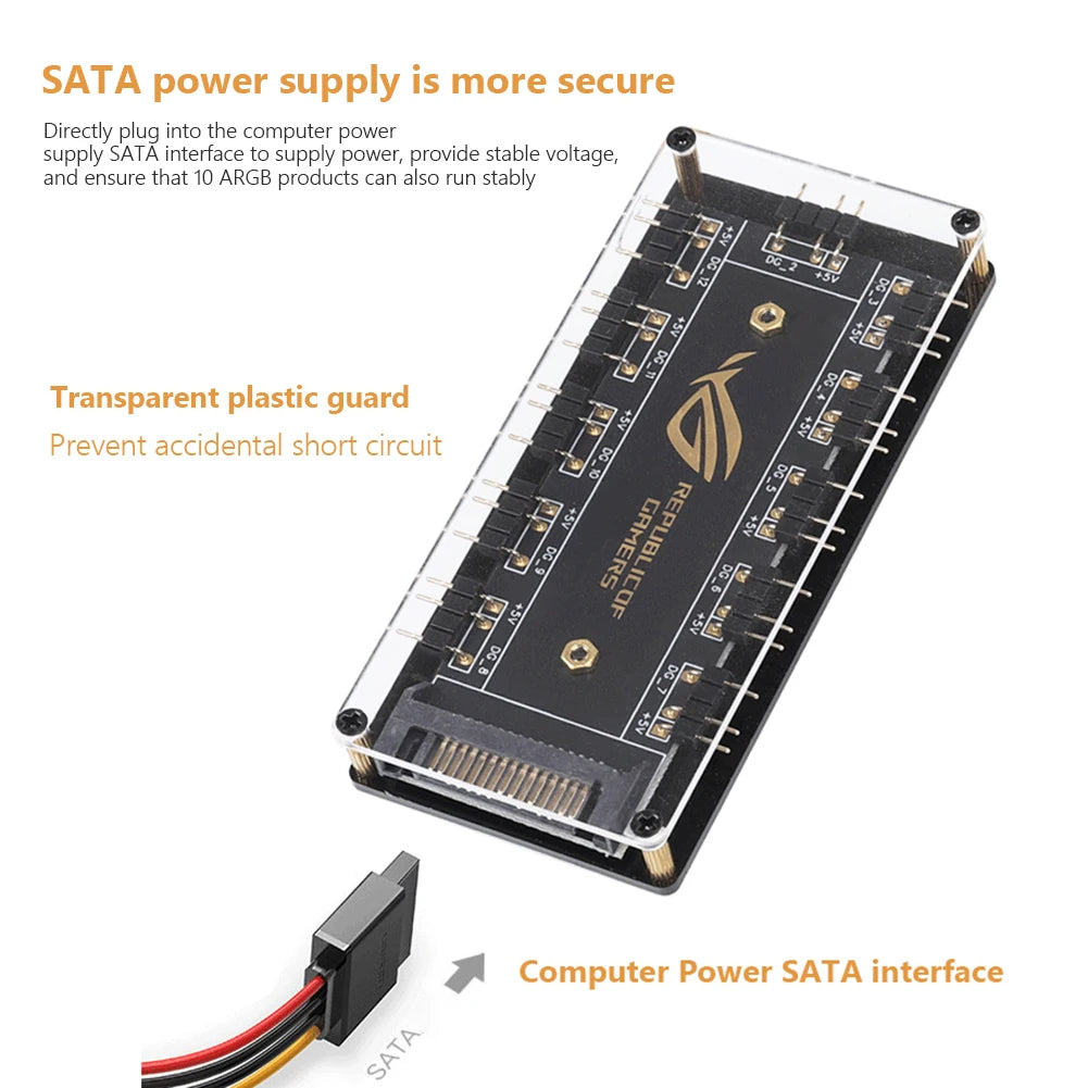 5V 3-Pin ARGB RGBW Cable: ASUS AURA SYNC Compatible, 10 Hub Splitter with SATA Power Extension Adapter - for LED Strip Lights, PC RGB Fans, Coolers