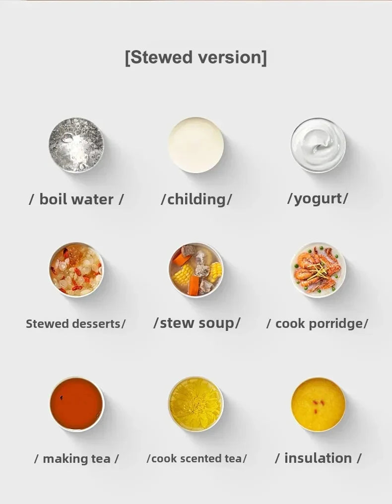 🚗 Dual Power Supply Ports — 220V household power port for fast boiling, and Type-C power port for keeping warm when traveling with a power bank, car charger, or other adapters.