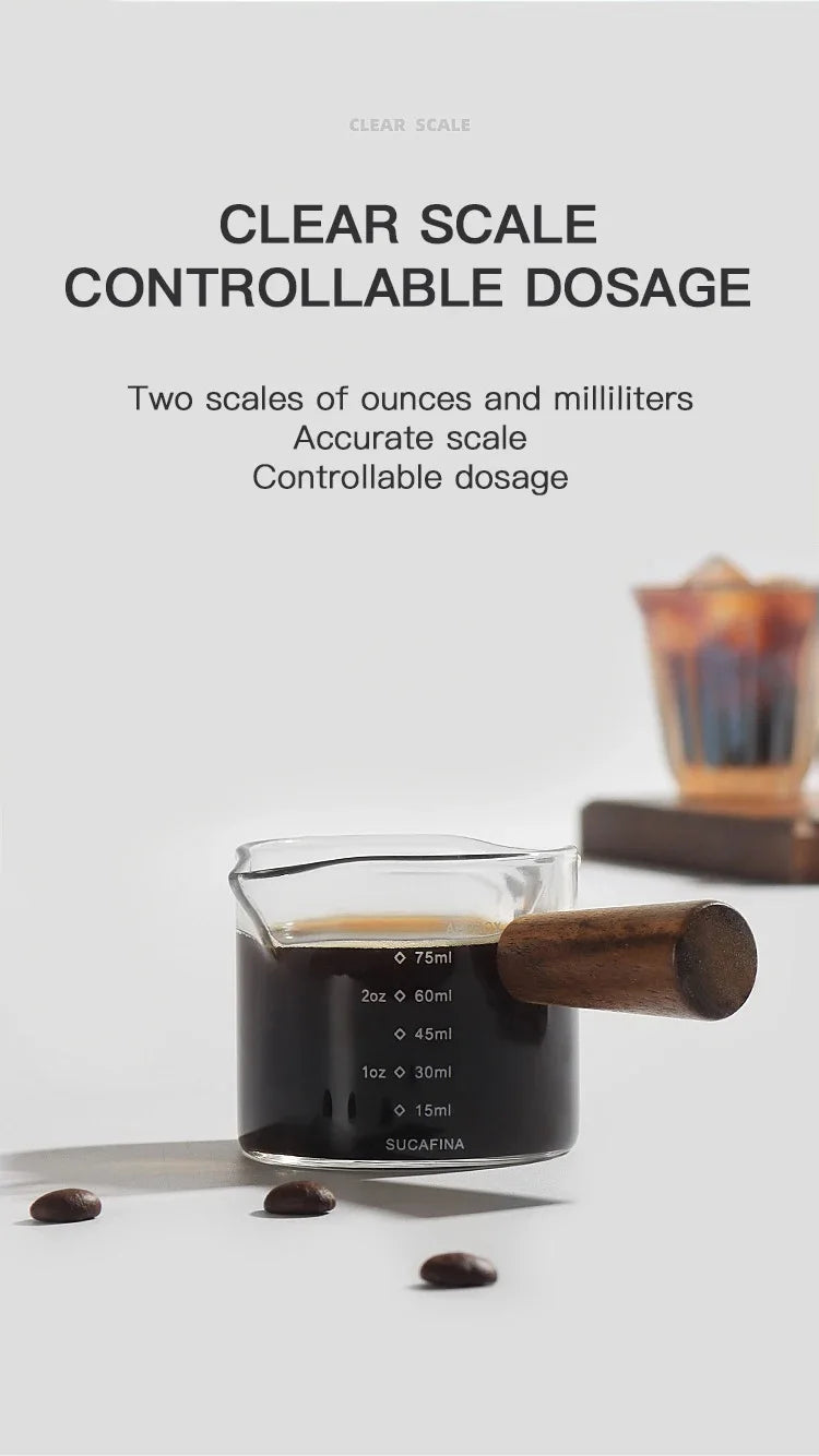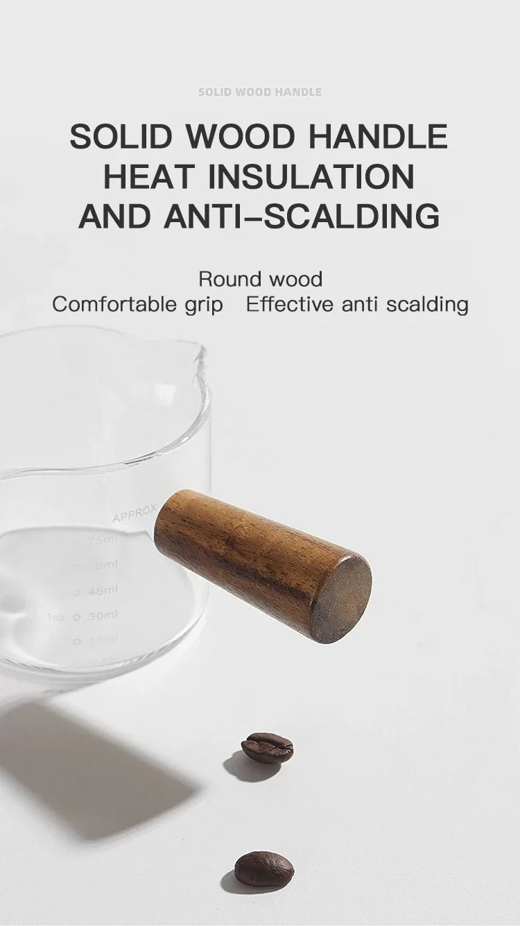 75ML Glass Coffee Measuring Cup with Wooden Handle — Espresso, Milk & Latte Transparent Cup with Scale, Kitchen Coffee Barista Tool