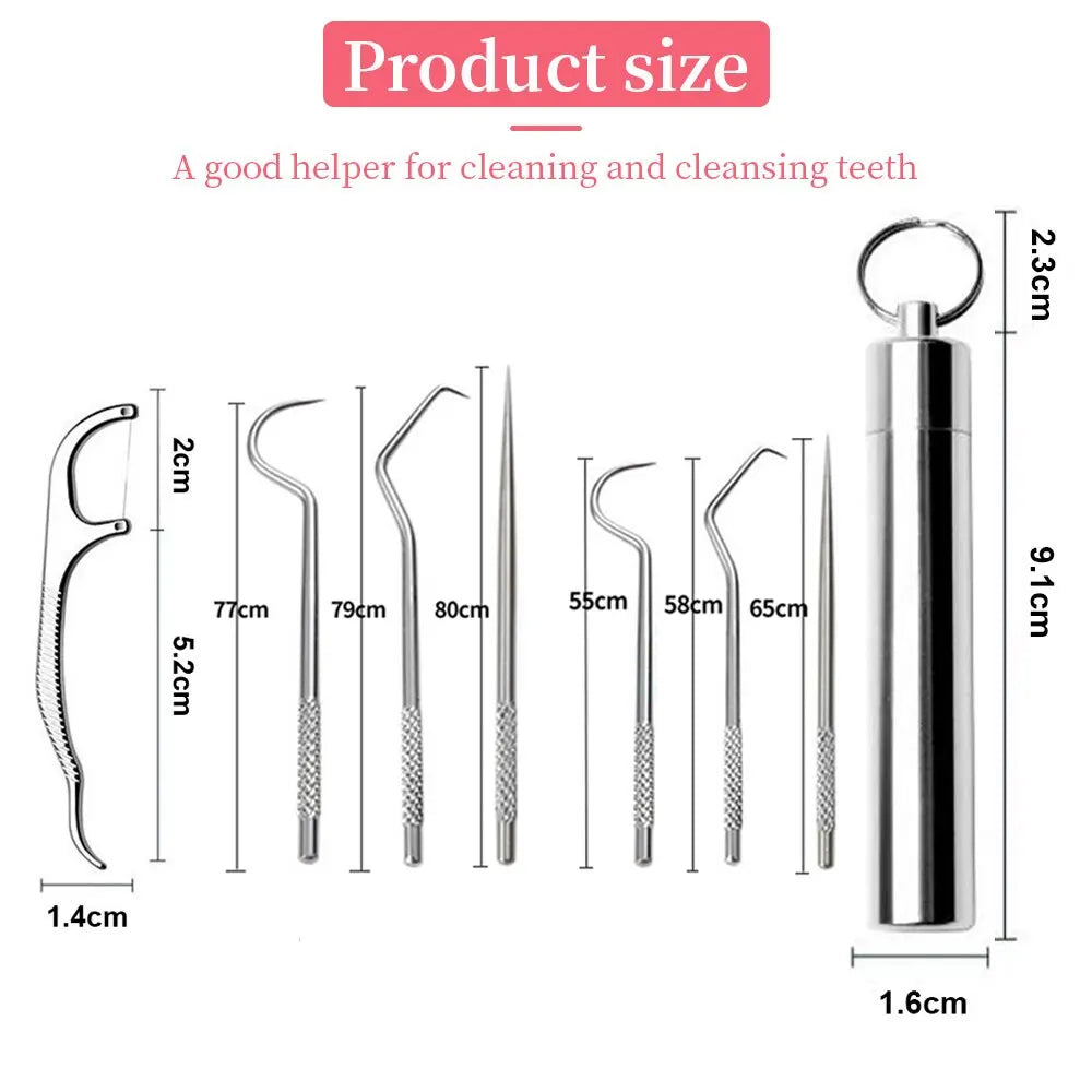 7pcs Stainless Steel Toothpick Set: Reusable Tooth Flossing Picks for Oral Cleaning - Portable Teeth Cleaner Kit