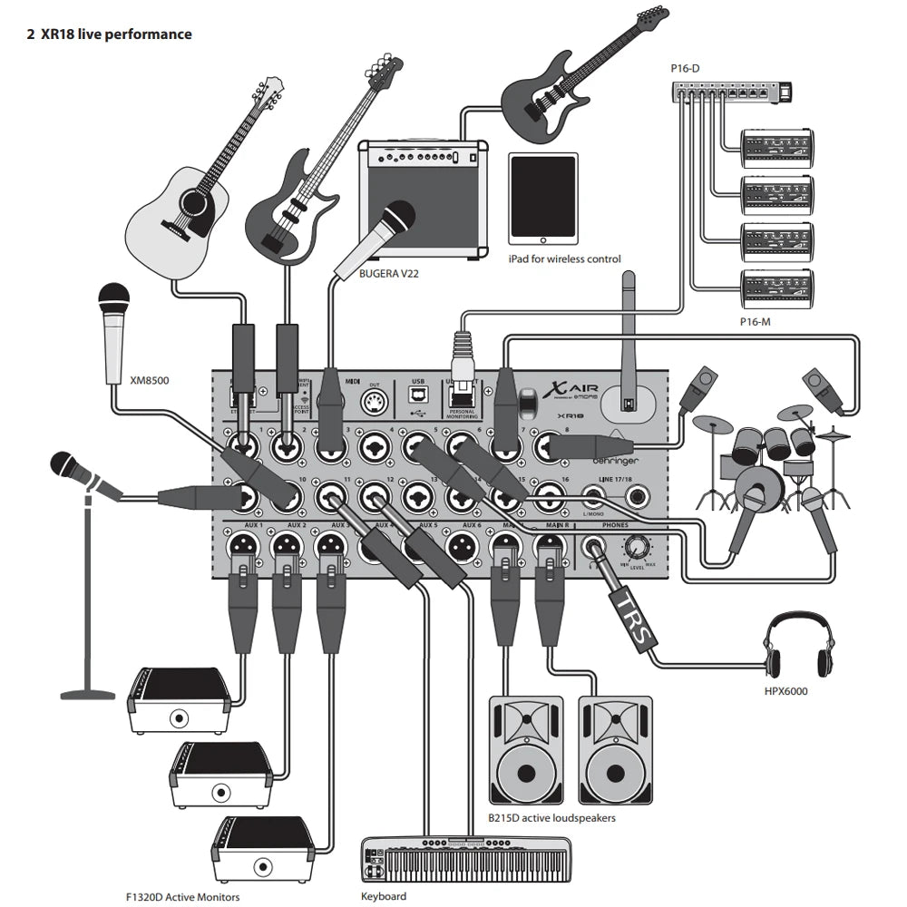 🎚️ 18 Channels – 16 XLR/TRS mic inputs, 2 line inputs
