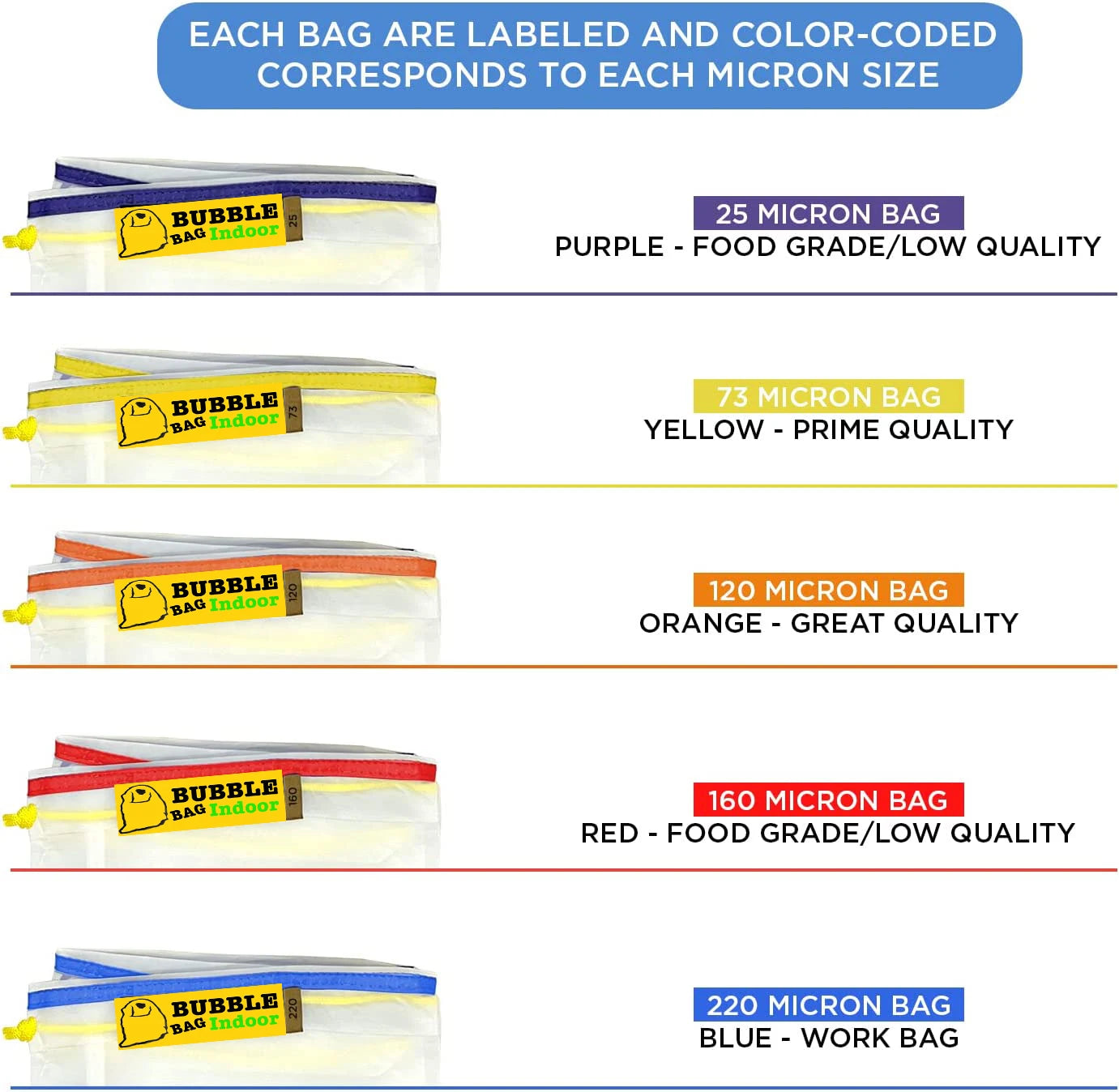 Multi-Micron Filtration: Purple (25), Yellow (73), Green (120), Red (160), Blue (220) – perfect for separating fine and coarse herbal extracts.