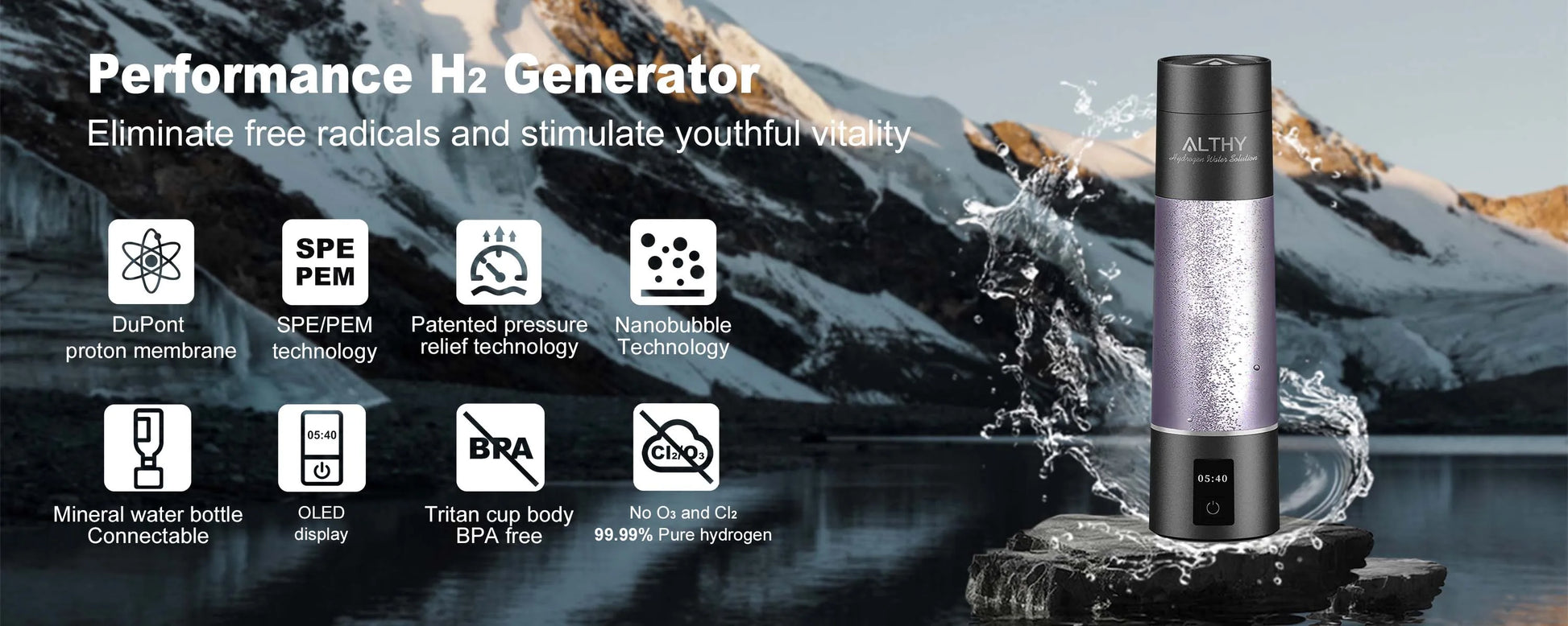 ALTHY Molecular Hydrogen Water Generator Bottle - DuPont SPE&PEM Dual Chamber Ionizer with Charging & Time Display