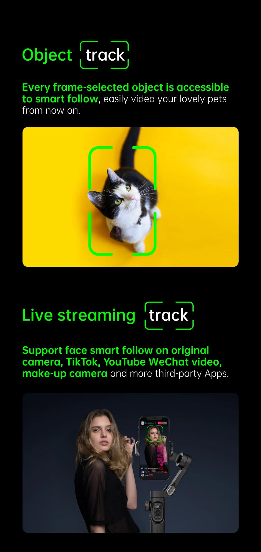 The gimbal features AI Face Tracking with SmartXE technology, automatically following your face to keep you centered in every frame. Capture memorable moments with the Smile Snapshot feature, which triggers a photo when you smile. Perfect for video calls, online teaching, or social media videos, it adds a professional touch to all your content.