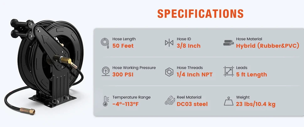 Wide Compatibility: The reel comes with everything you need for a hassle-free setup, including a 3/8" QC plug, M22 14mm male adapter, and 360° swivel water or air inlet (3/8" NPT female thread). It fits most pressure washer hoses, air hoses, and oil hoses, and supports working pressures up to 4000 PSI and temperatures as high as 212°F (100°C).