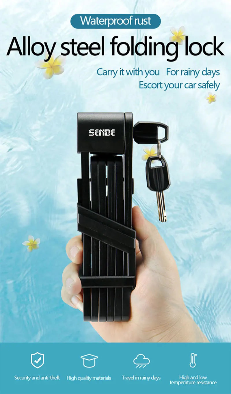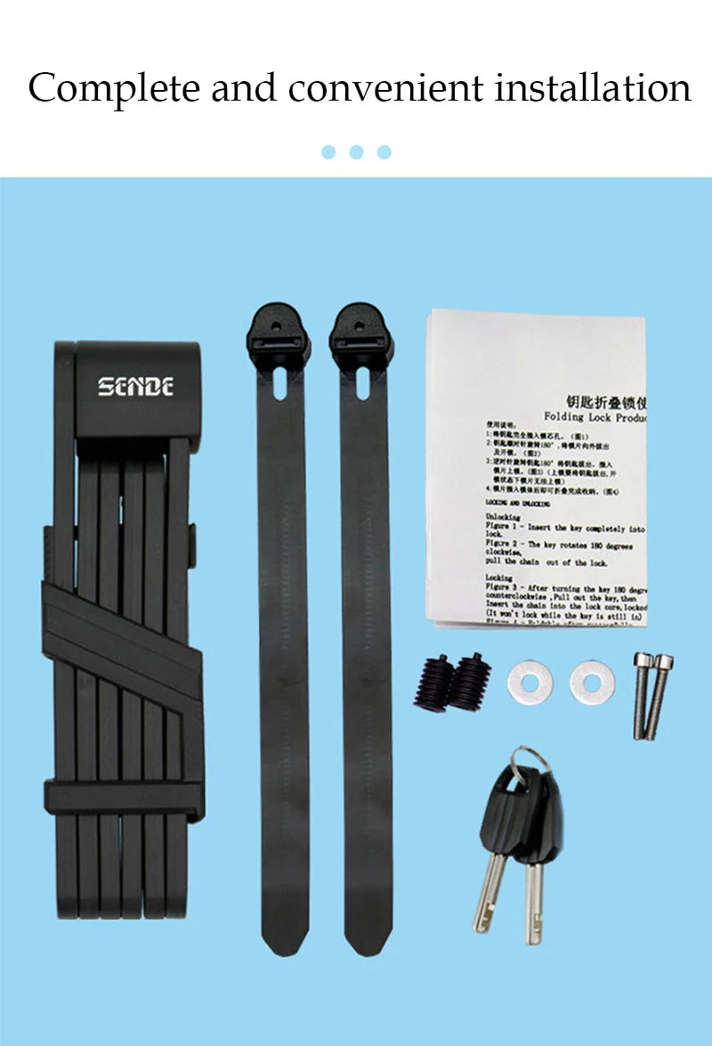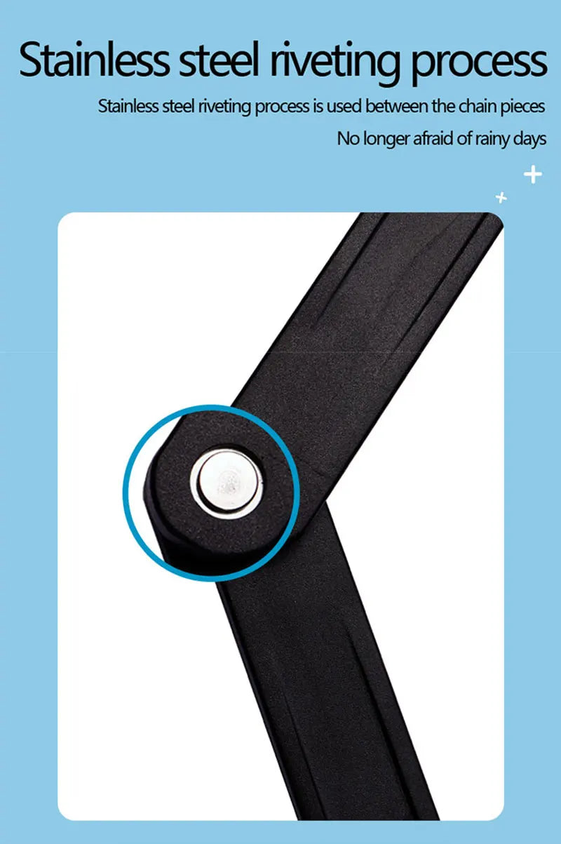 Worried about bike theft? Keep your bicycle safe and sound with the Bicycle Folding Chain Lock, the perfect combination of portability, strength, and security. Whether you're riding around the city, commuting, or parking your bike at your favorite café, this foldable bike lock ensures peace of mind, protecting your ride against potential thieves.