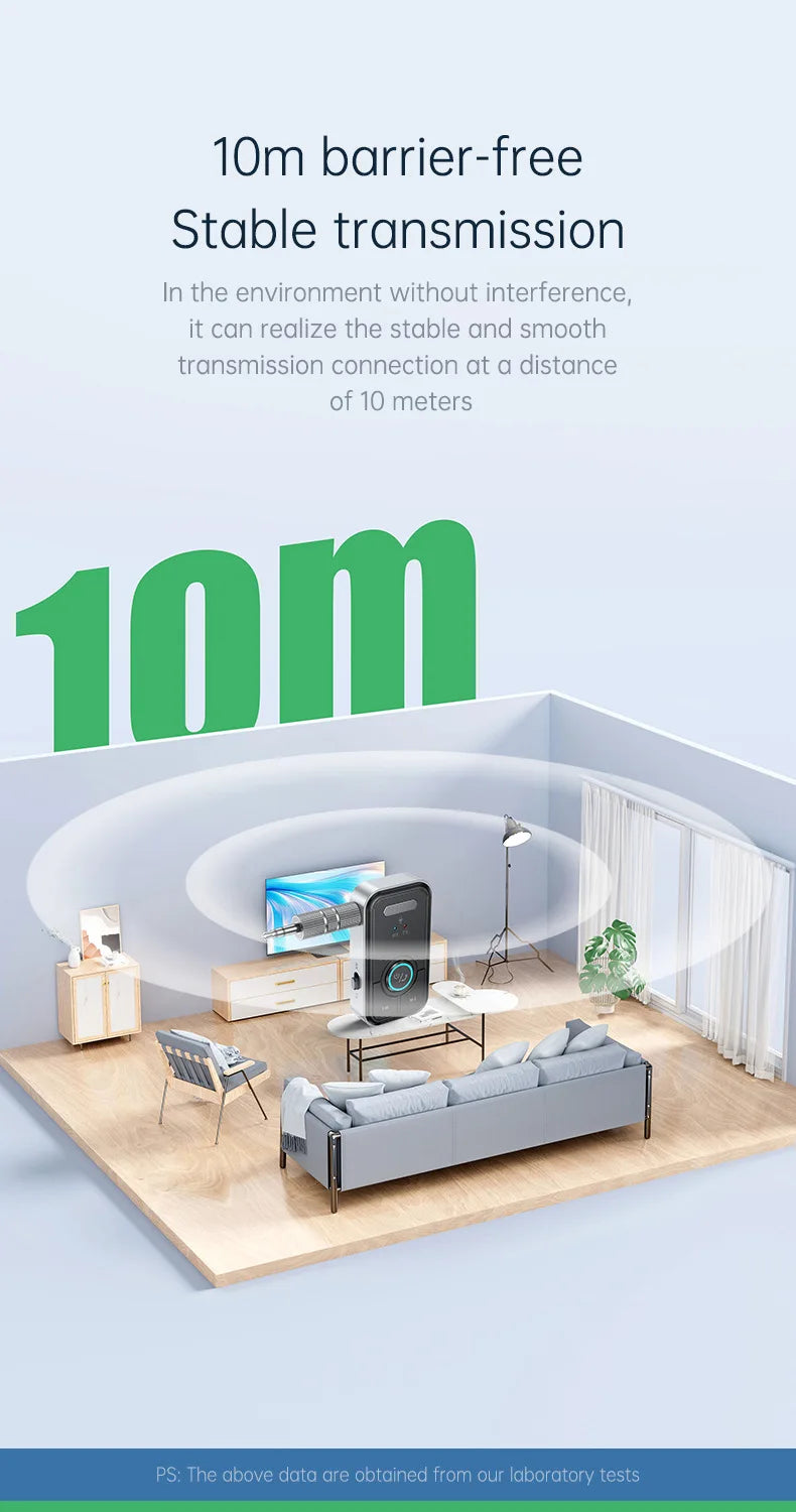 Transmitter and Receiver Modes: Switch between wireless receiver or transmitter modes easily to enjoy stereo audio from your headphones, speakers, or car system. Whether you're playing music from your phone or connecting your device to an audio system, this adapter has you covered.