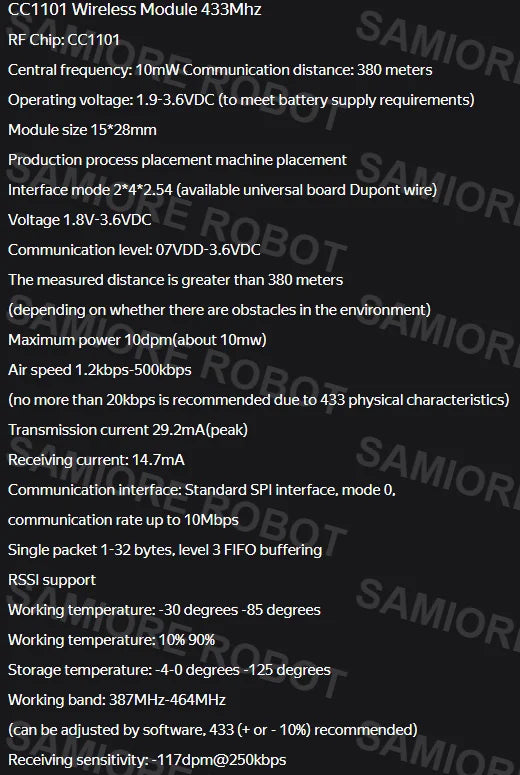 Unlock the power of wireless communication for your Arduino and DIY electronics projects with the CC1101 433MHz Wireless Module from SAMIORE ROBOT. Designed for long-range, reliable data transmission, this 433MHz transceiver module comes equipped with an SMA antenna for enhanced signal strength, making it perfect for home automation, remote control systems, IoT applications, and wireless sensor networks.