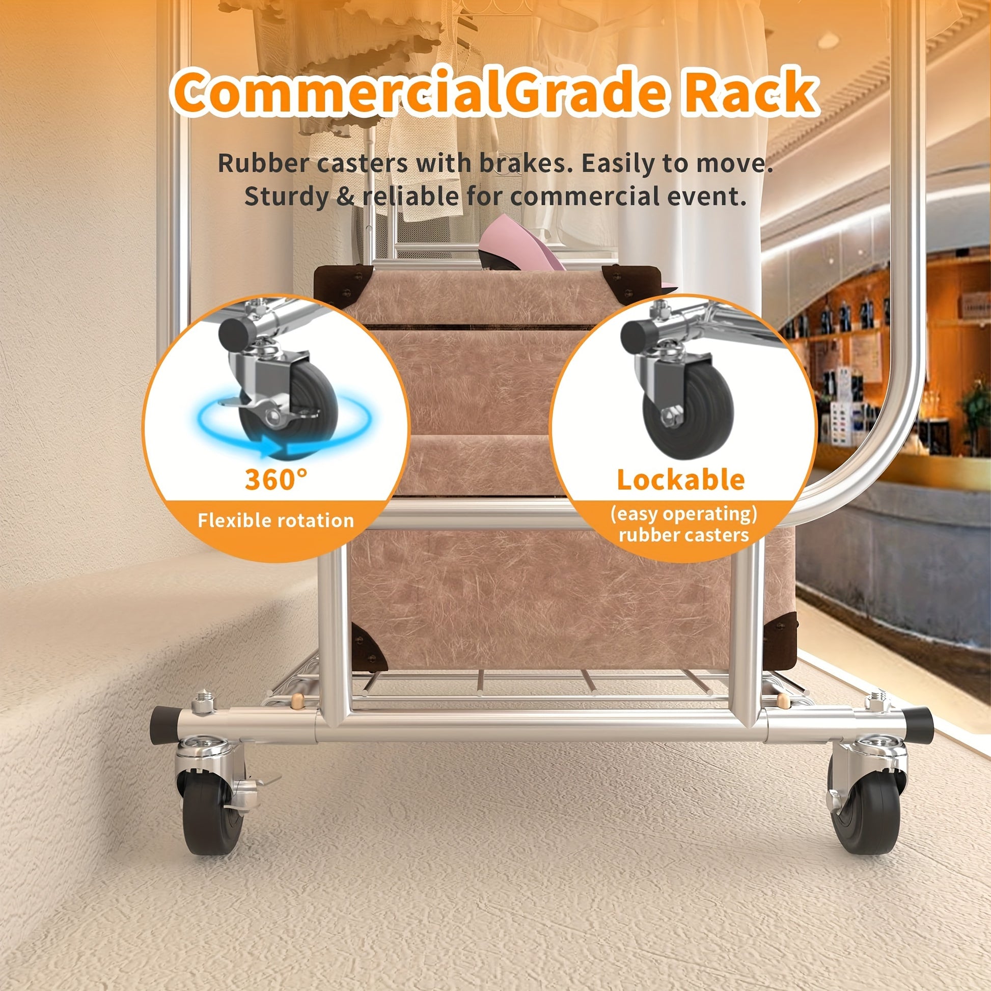 This rolling metal clothing rack is more than just storage – it’s a practical and elegant solution for managing your clothing. Whether you need it for personal use or commercial purposes, its heavy-duty capacity and portable design ensure it can adapt to any setting. From your walk-in closet to a busy fashion event, this rack is built to impress.