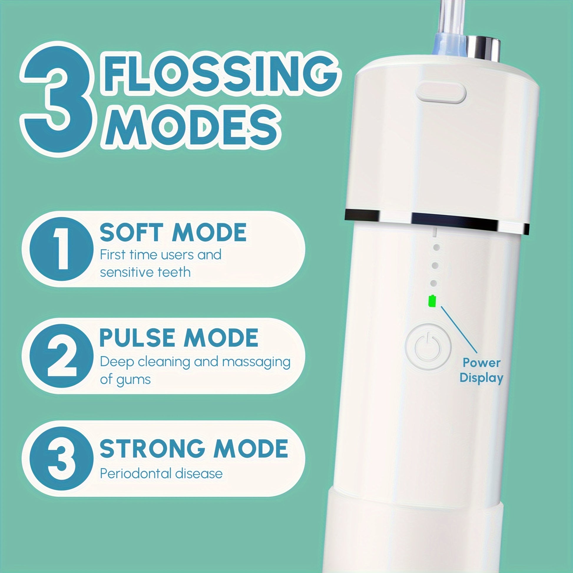 Adjustable Modes and Low Noise for Tailored Cleaning: With three adjustable cleaning modes—Normal, Soft, and Pulse—this water flosser caters to various dental needs, from daily cleaning to sensitive gum care. The low-noise design ensures a comfortable and quiet experience, perfect for use in any setting.