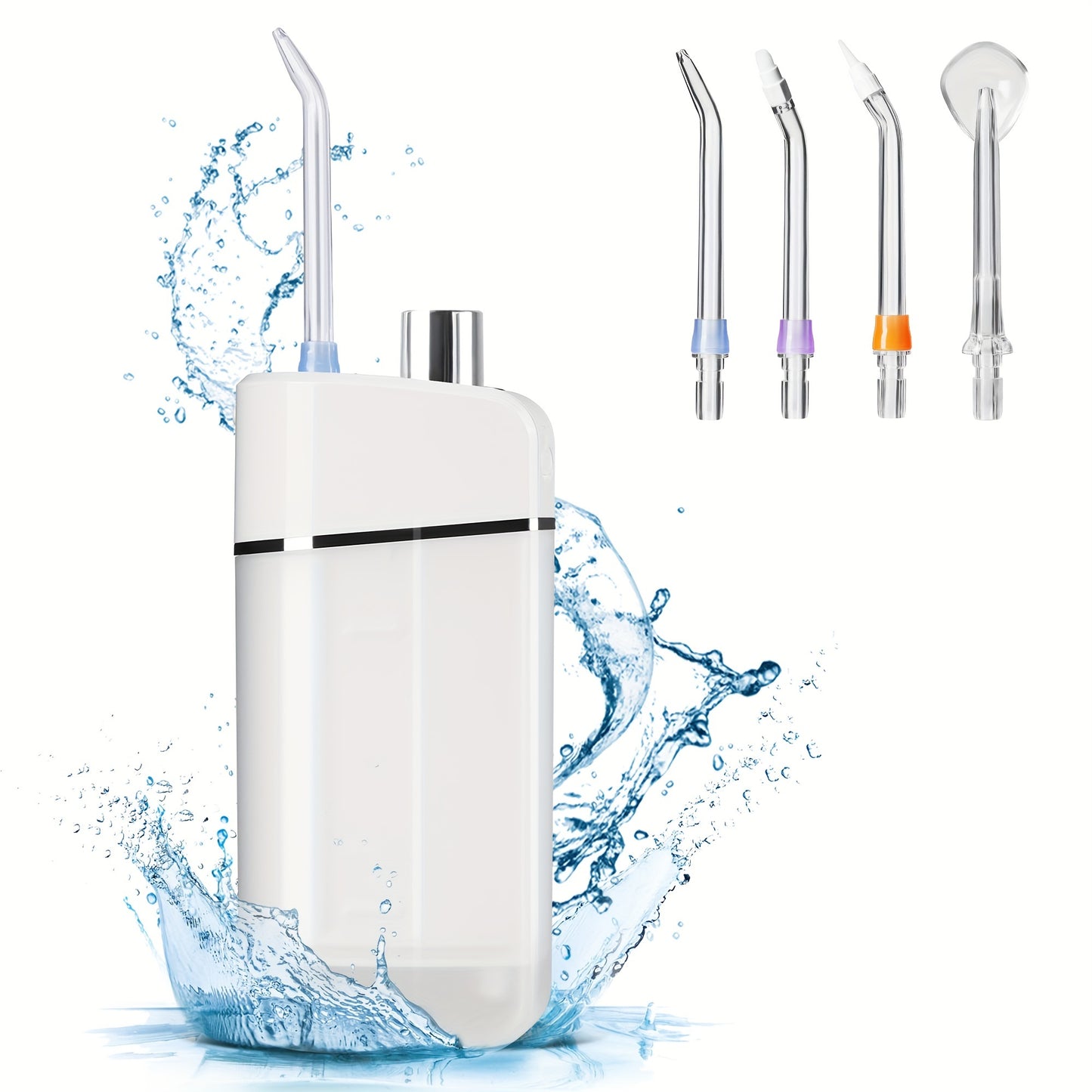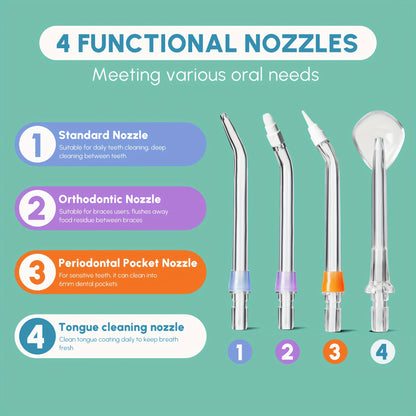 Includes 4 Interchangeable Nozzles for Versatile Use: Equipped with 4 interchangeable nozzles and 3 nozzle caps, this flosser adapts to different areas of the mouth and is ideal for the whole family. It’s especially beneficial for those with braces, bridges, and implants, providing deep cleaning and targeted care.