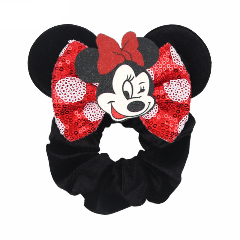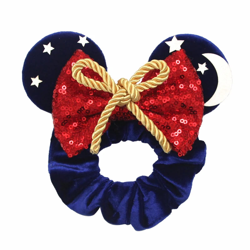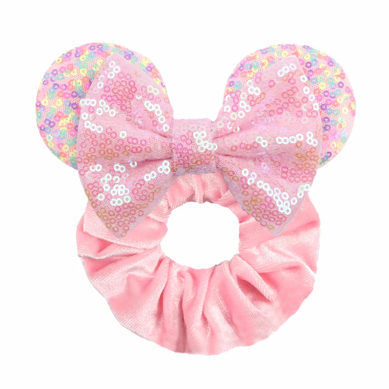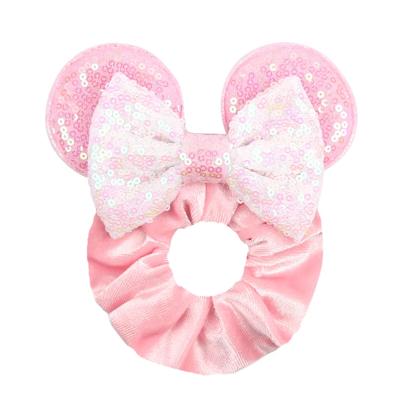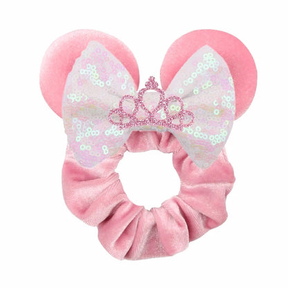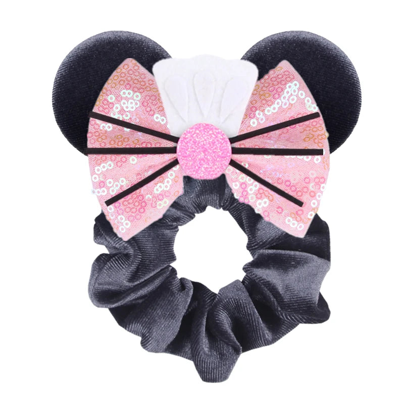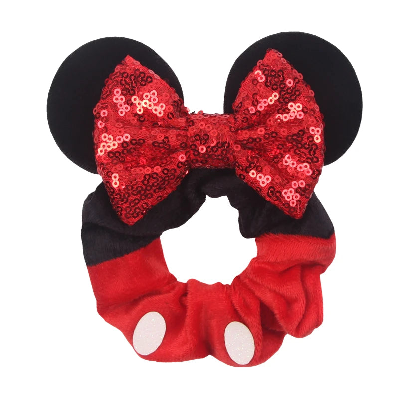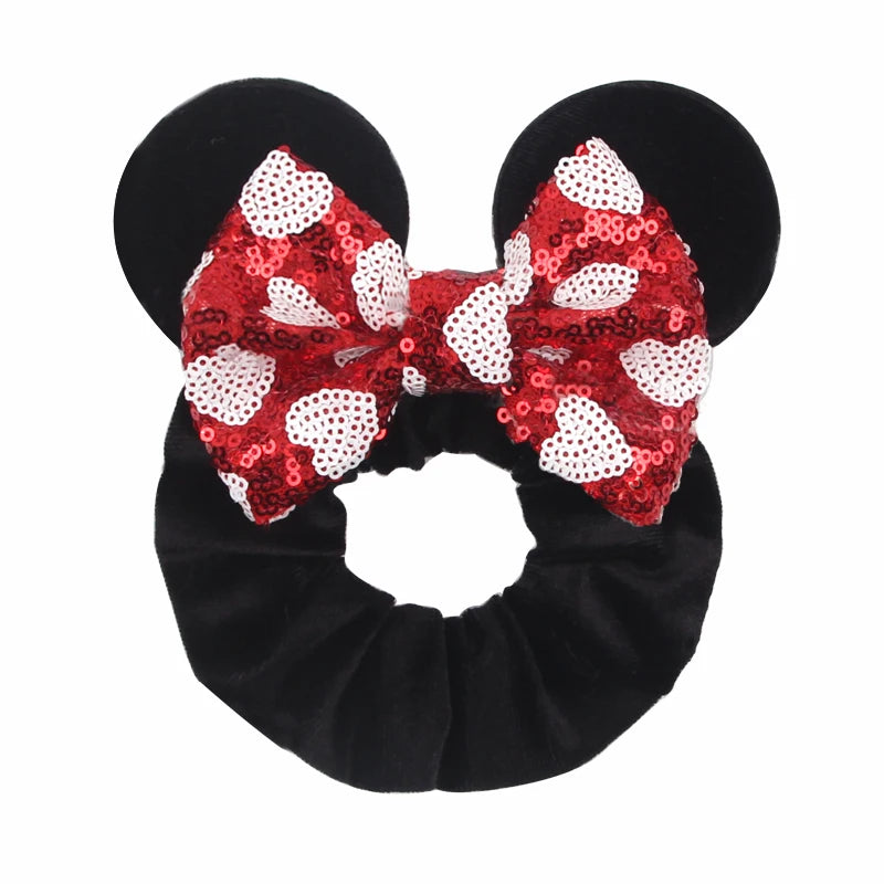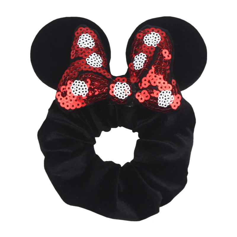 Disney Mouse Ears Velvet Scrunchies: Elastic Ponytail Holder with Sequin Bow - Perfect Hair Accessories for Women, Girls, and Kids' Parties