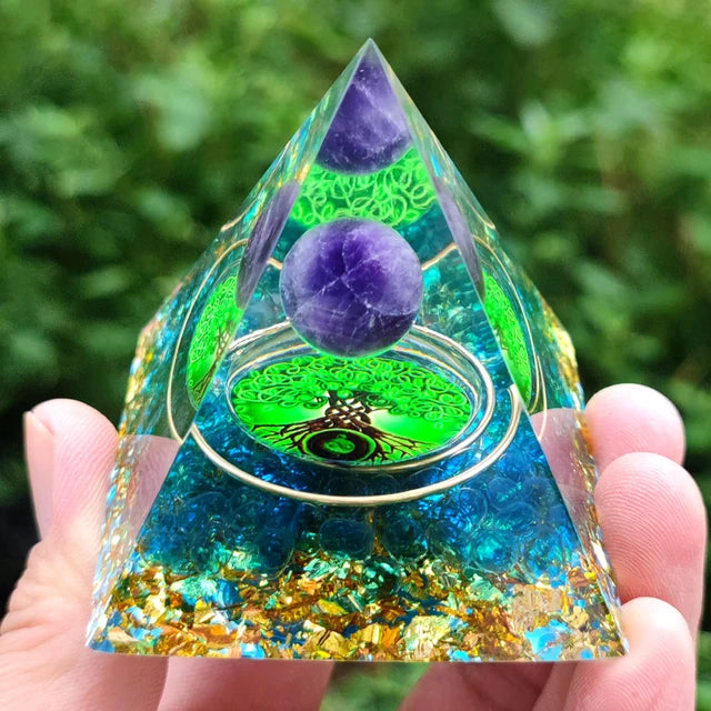 Amethyst Peridot Orgone Pyramid - Energy Generator Crystal Reiki Chakra Orgonite Meditation Tool