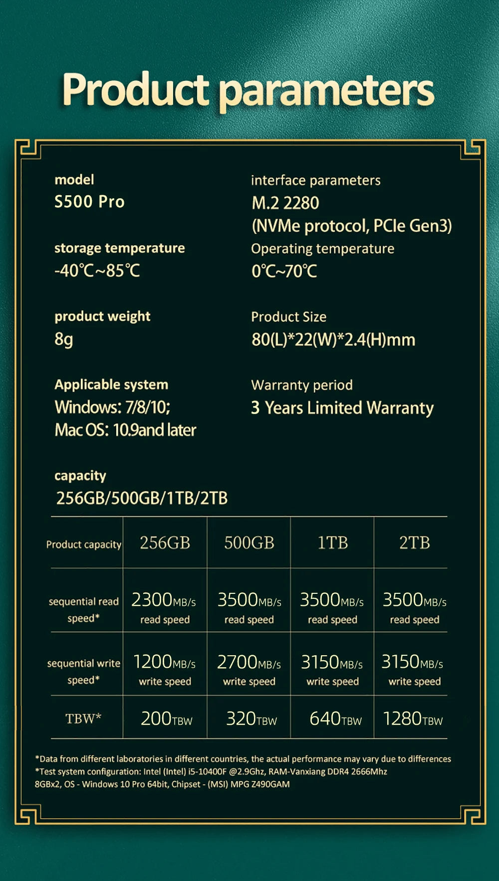 - S500Pro (PCIe 3.0): Up to 3500MB/s read and 3150MB/s write