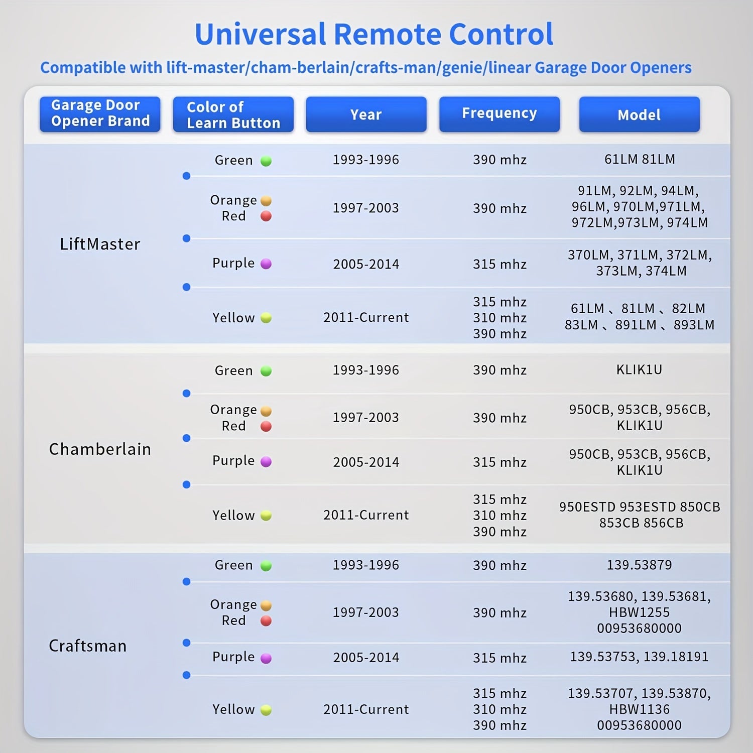 Easily control your garage door with the Universal Garage Door Opener Remote designed for LiftMaster, Chamberlain, and Sears Craftsman openers from 1993 to the present. Whether you're replacing a lost remote or adding an extra for multiple vehicles, this remote offers reliable, hassle-free access to your garage.