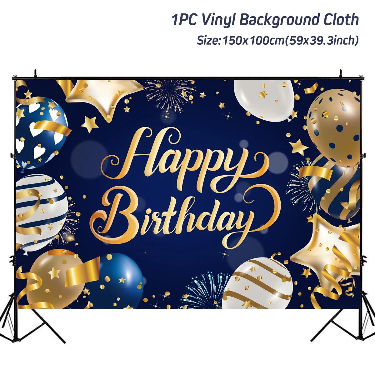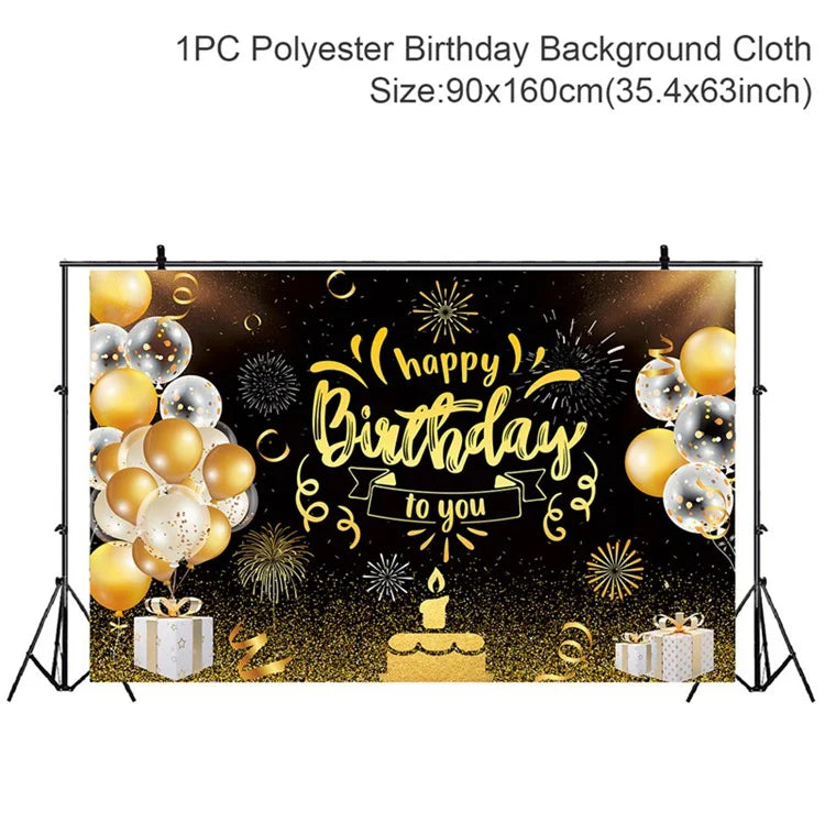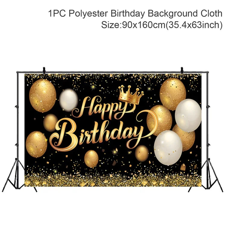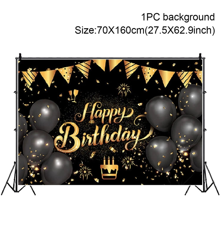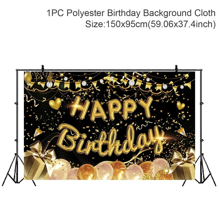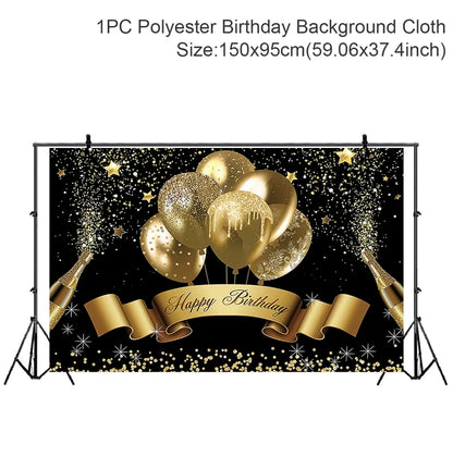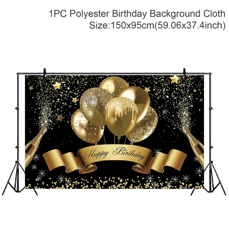 Gold Glitter Happy Birthday Party Backdrop - Black Adult Theme Photo Decoration, DIY Backdrops for Party Supplies