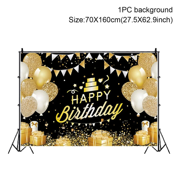 Celebrate your special day in style with the Gold Glitter Happy Birthday Party Backdrop, a stunning addition to any birthday party or themed celebration. Designed with a black background and bold gold glitter text, this backdrop sets the perfect scene for capturing memorable photos. Made from high-quality polyester, it's durable, easy to hang, and creates a glamorous atmosphere for any adult birthday party. Whether you’re hosting a milestone celebration or an elegant soirée, this eye-catching backdrop is a must-have for adding sparkle and sophistication to your event decor.