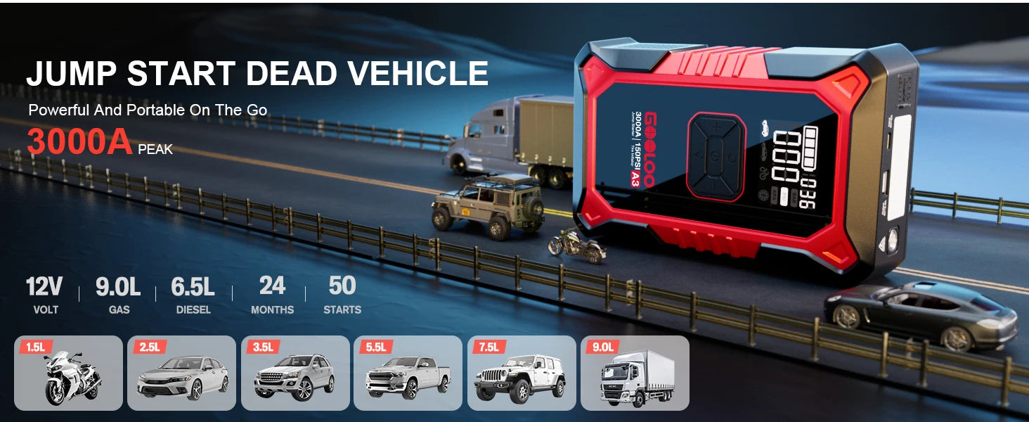 Looking for the ultimate roadside hero? Meet the GOOLOO A3 Jump Starter with Air Compressor, your all-in-one powerhouse designed to jump-start your day—and your vehicle—without breaking a sweat. This rugged yet portable 3000A battery booster is built to handle it all, whether you’re revving up a 9.0L gas engine, a 6.5L diesel beast, or inflating tires with its 150PSI air compressor equipped with auto shut-off. No more flagging down strangers or waiting for roadside assistance—this smart tool has your back!