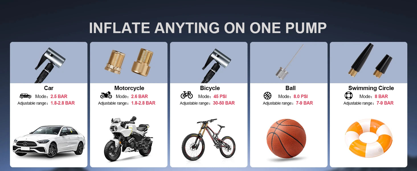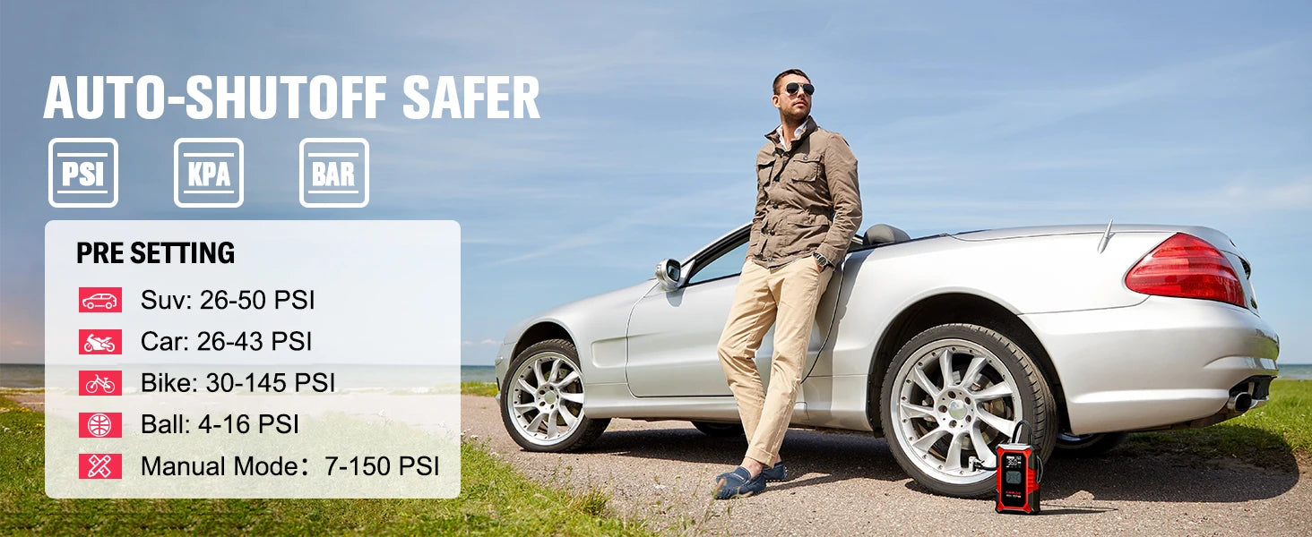 Low tire? No problem. The 150PSI air compressor inflates tires fast and shuts off automatically when done. Perfect for cars, bikes, and even inflatables on camping trips.
