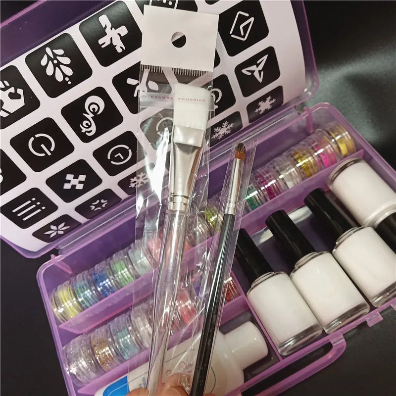 Complete Kit: Includes stencils, glue, brush, and glitter powder for easy body art.