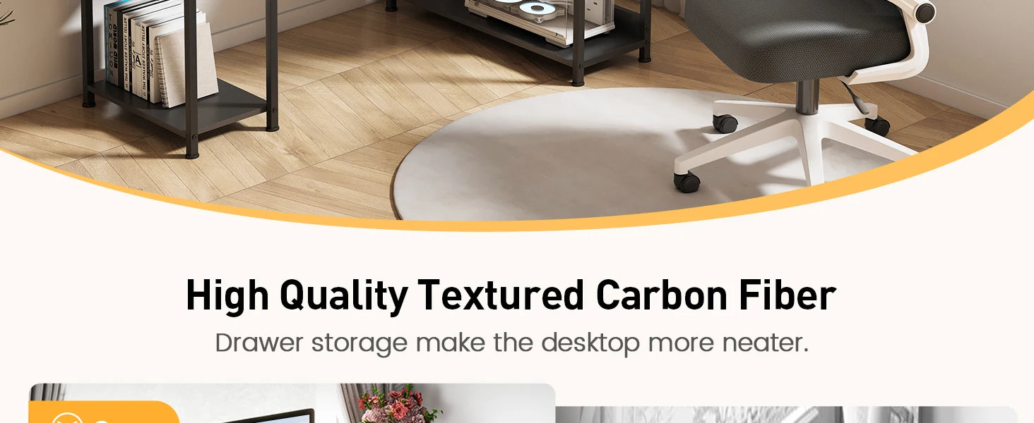 Upgrade your gaming and workspace with the L-Shape Gaming Desk with Drawers, designed for home office, gaming setups, and study areas. Featuring a luxurious carbon fiber finish, this desk combines style, storage, and functionality. Equipped with two top drawers, a small monitor stand, and a wire organizer grommet, it keeps your workspace neat while maximizing surface area. Rounded corners and an anti-fall panel design make it safe and family-friendly.
