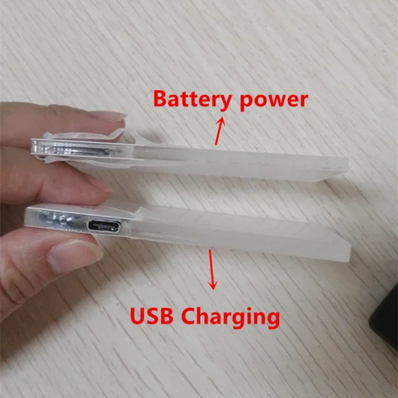 Compact and Lightweight Design: Measuring 9x5.5 cm with a thickness of approximately 4mm for the battery model and 5mm for the USB charging model, this acrylic board is lightweight and easy to carry. It’s perfect for displaying on desks, shelves, or as a portable name tag.
