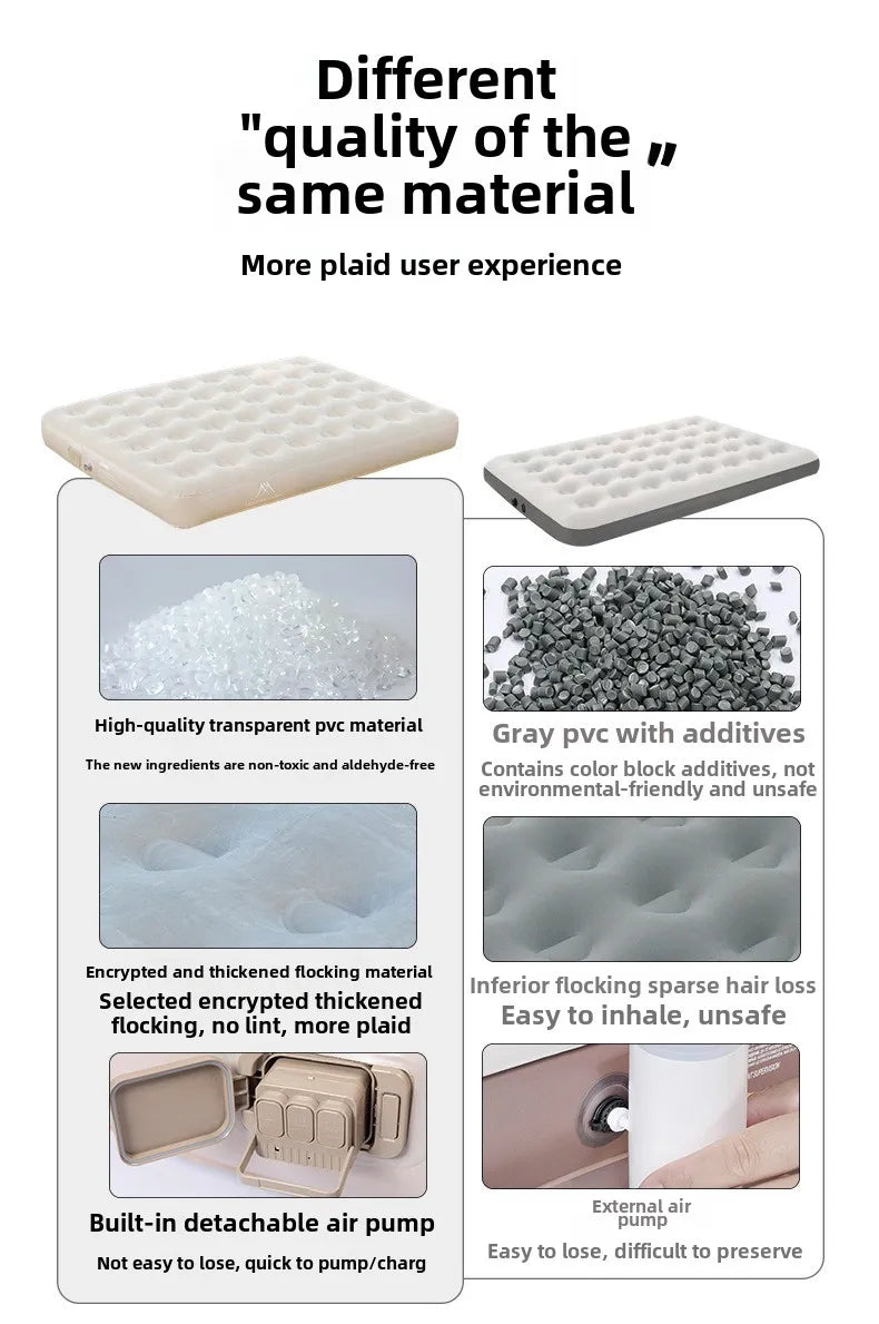 - Premium Materials: The upper surface is crafted with soft flocking material, ensuring a cozy night's sleep, while the sturdy PVC bottom resists wear and tear. ABS air nozzles provide secure inflation and deflation without leaks.