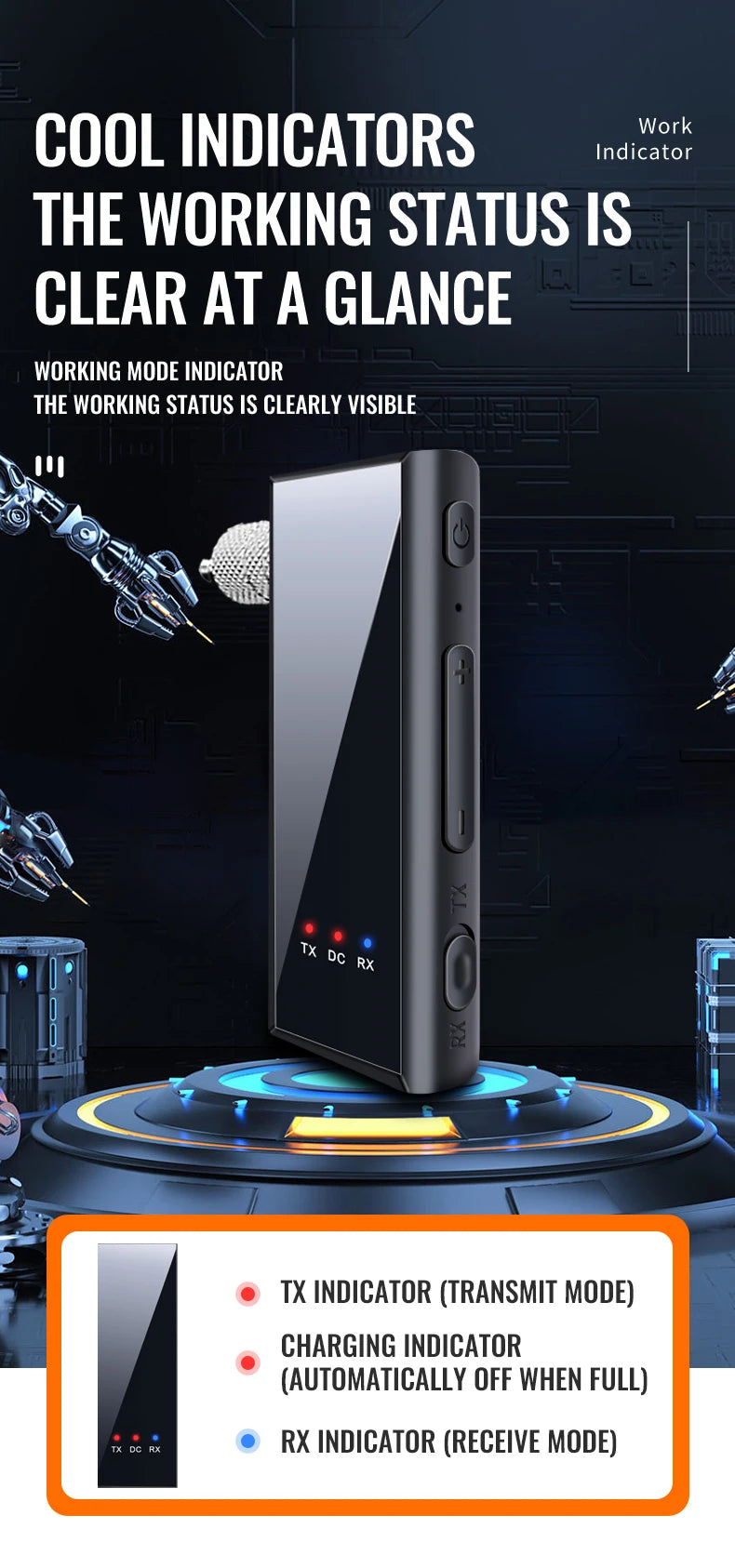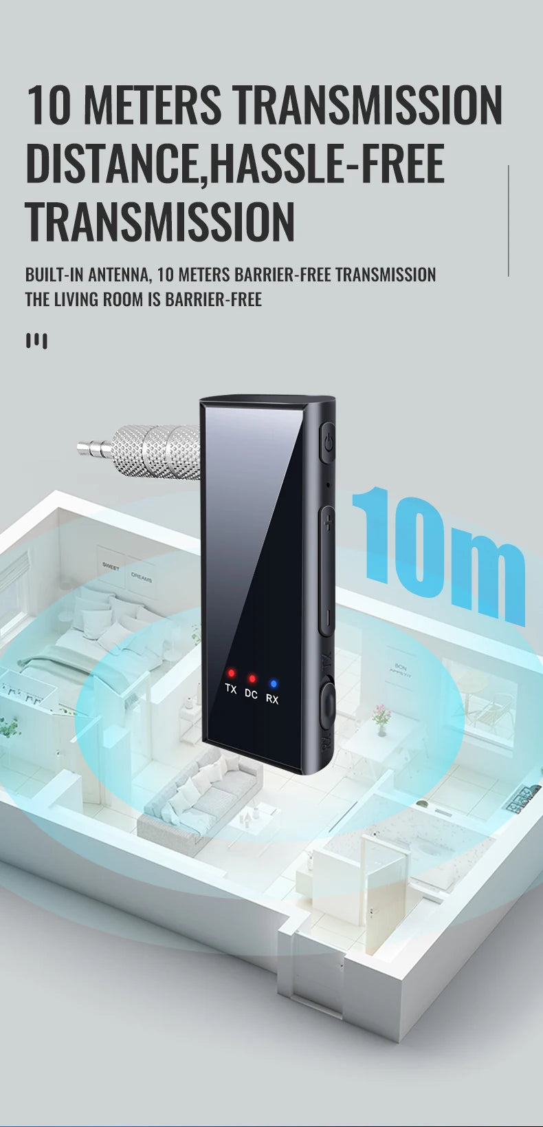 - Transmitter Mode (TX): Perfect for airplanes, TVs, PCs, and other devices to send audio wirelessly to Bluetooth speakers, headphones, or earphones.