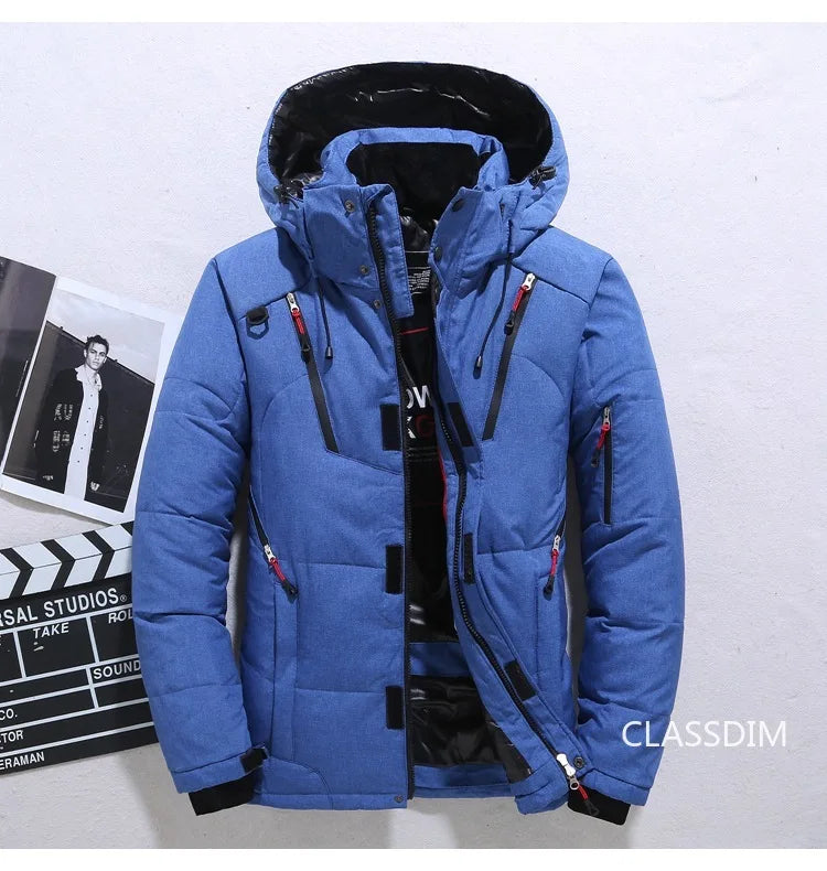 Men's Winter Hooded Puffer Jacket – White Duck Down Coat, Windproof & Warm Outdoor Parka, Size 5