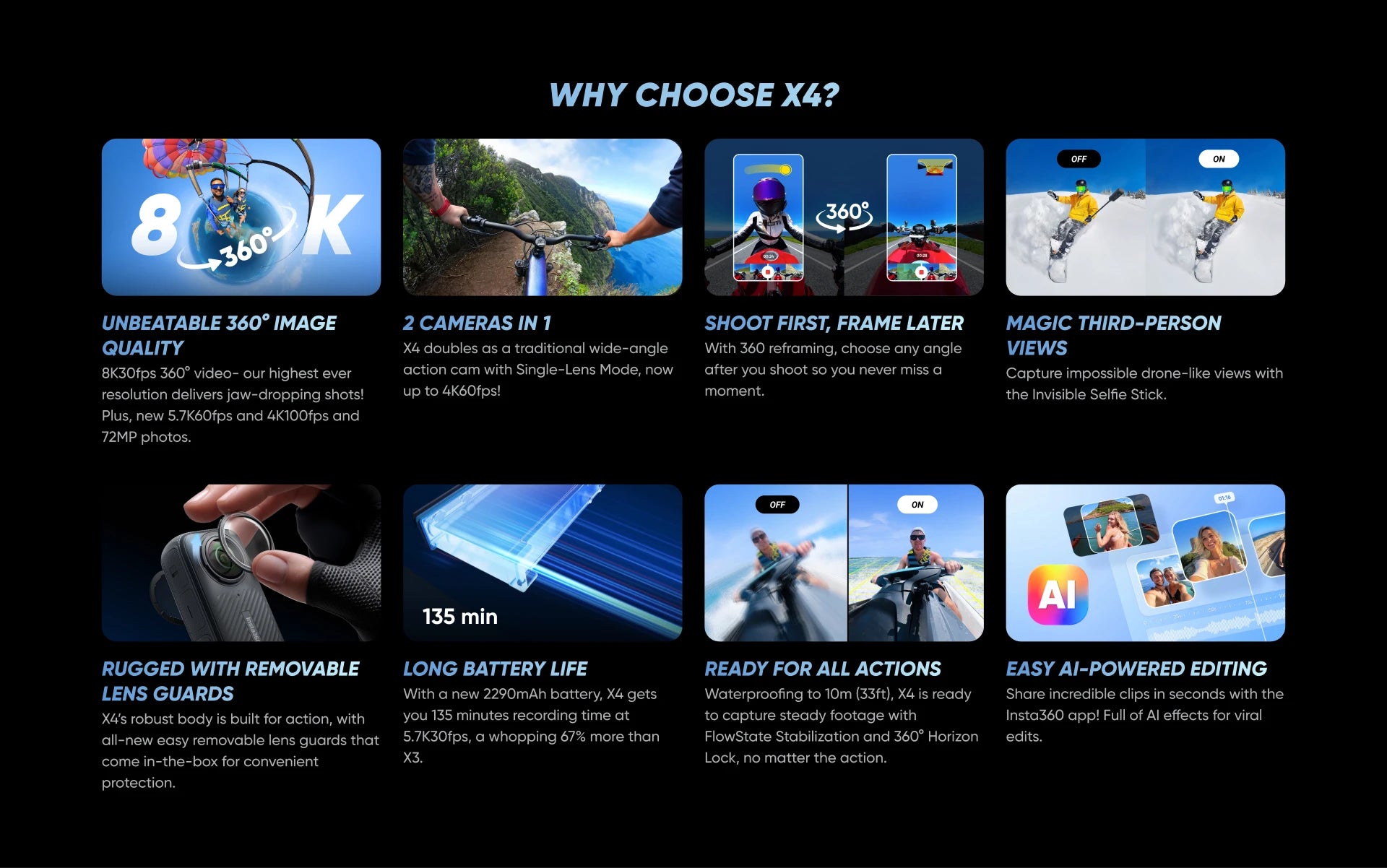 Whether you're snowboarding down the slopes, snorkeling with sea turtles, or vlogging your city explorations, the Insta360 X4 has you covered: