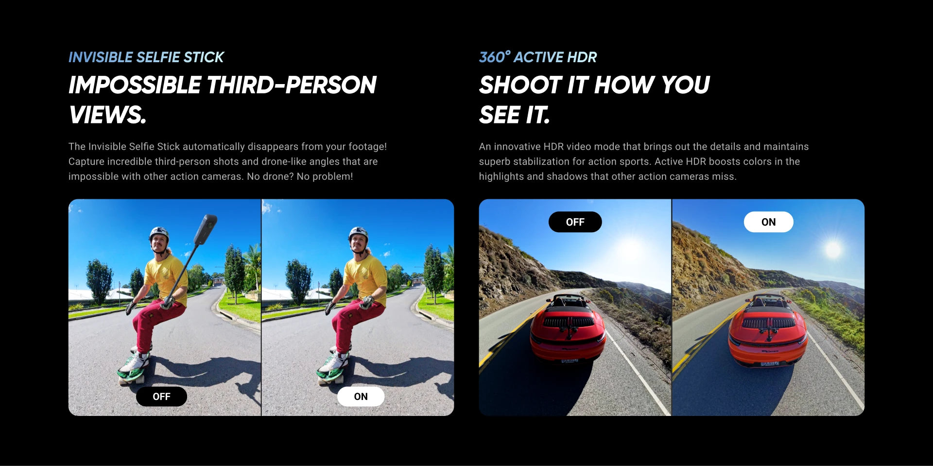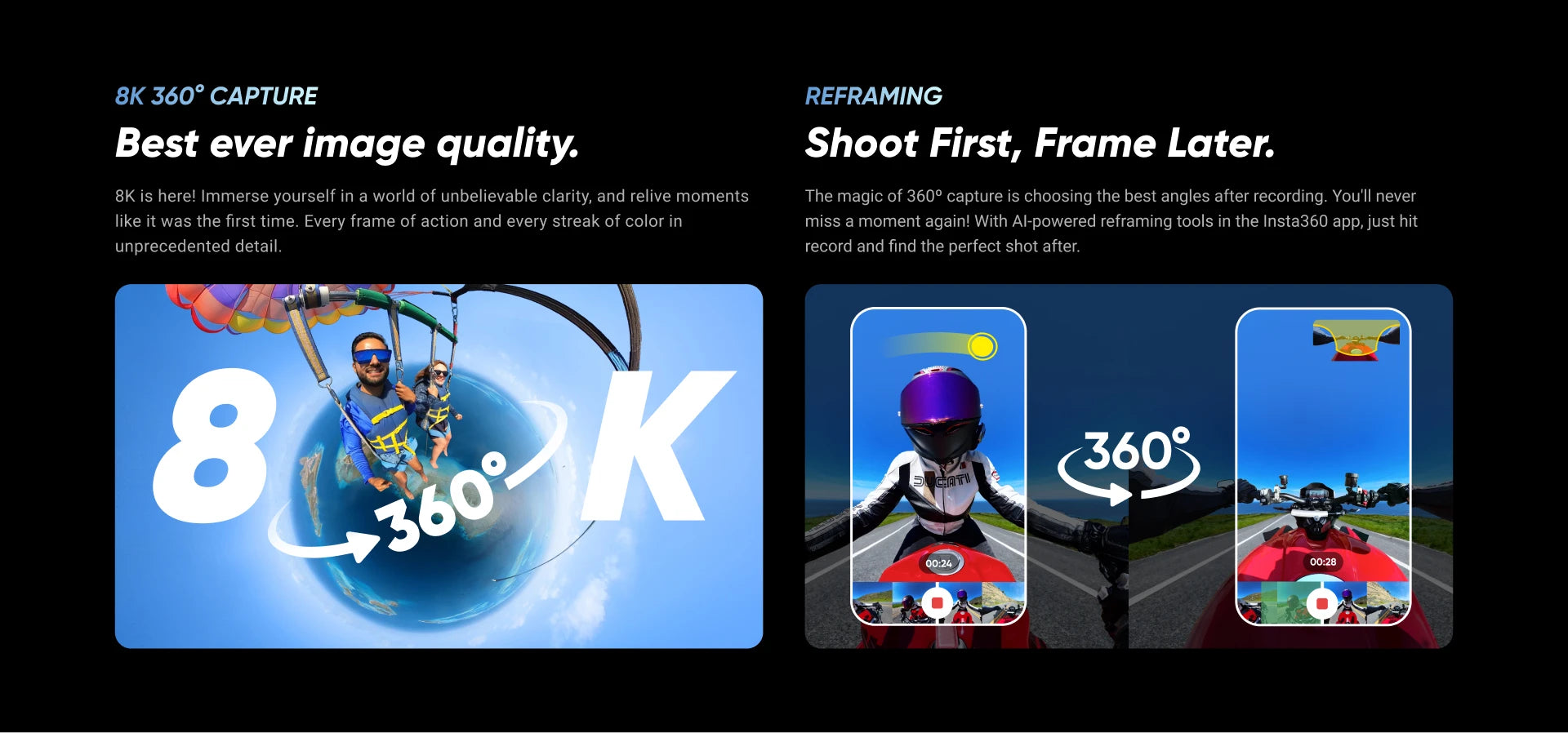 - 8K 360° Video Recording: Immerse your audience in breathtaking 8K resolution and cinematic clarity.