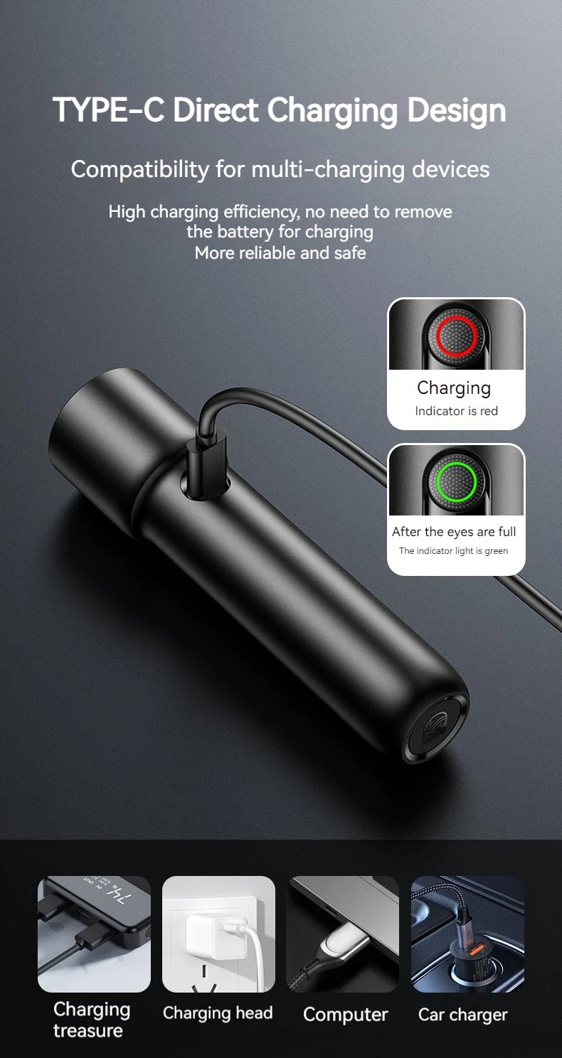 Rechargeable & Eco-Friendly: No more fumbling with disposable batteries! Powered by a built-in 18650 lithium battery and convenient USB Type-C charging, this flashlight is always ready when you need it.