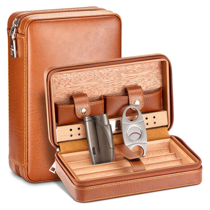 Portable Leather Cigar Humidor Box Set - Travel Cedar Wood Cigar Case with Cutter and Lighter - Essential Cigar Accessories